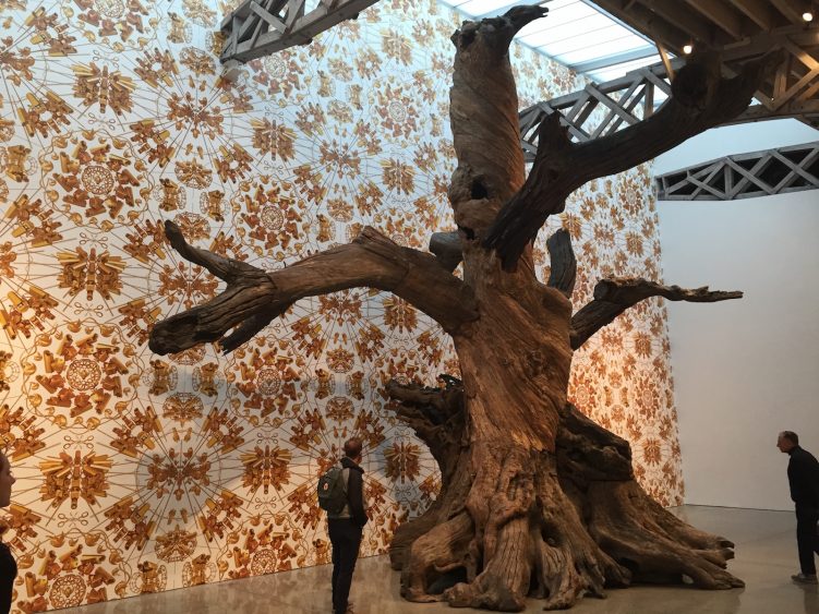 L’aventure des arbres d’Ai Weiwei a débuté dans les rues de Jingdezhen (sud de la Chine) où se vendent depuis des décennies des troncs, des branches, des racines d’arbres des forêts environnantes. Ces formes complexes trouvées dans la nature servent à la décoration des maisons et sont objets de contemplation perpétuant la tradition des rochers aux formes étranges des cabinets de lettrés. Pendant des années, Ai Weiwei achète des tronçons de ces vieux arbres et les entrepose dans son atelier de Pékin. C’est le temps de l’attente pour trouver un but à cette collection, pour qu’elle intègre le vocabulaire esthétique de l’artiste. Repenser les éléments originaux du passé pour penser le présent, une façon de poser la question de la destruction et de la préservation de l’héritage culturel. Il n’hésite pas dans ses installations à détourner, re-décorer, ré-assembler, voire détruire des objets ancestraux.