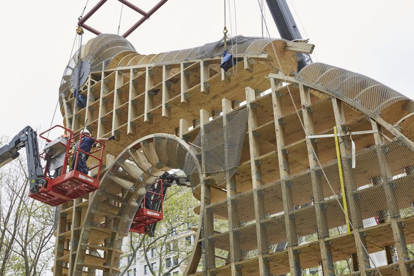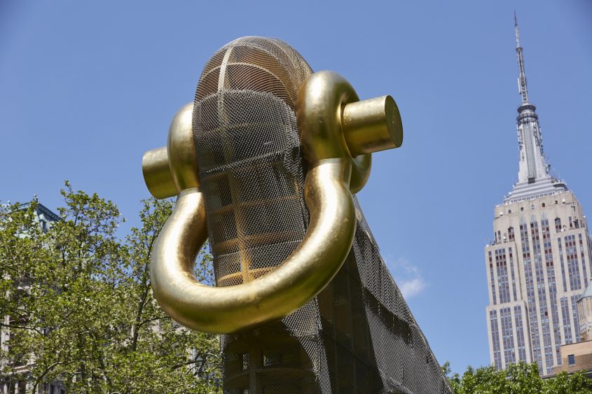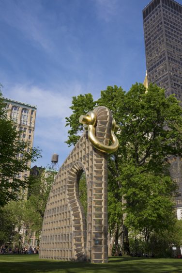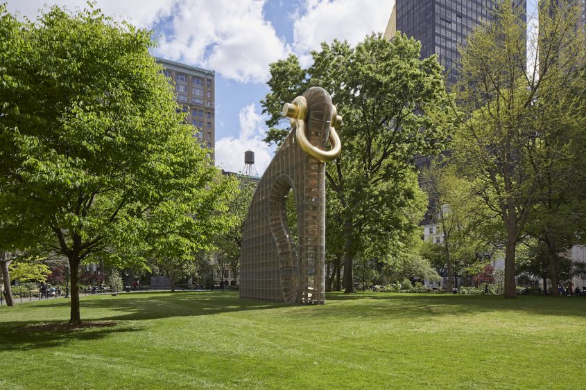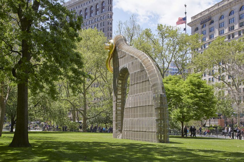 On reconnaît la signature de l’artiste à la forme à la fois abstraite et biomorphique de cette sculpture monumentale. Par sa taille, en revanche, l’artiste surpasse tout ce qu’il a pu créer dans le passé, y compris les nombreuses œuvres d’art public qui lui ont été commandées en Europe, Asie, ou aux Etats-Unis. Haute de 12 mètres, l’œuvre dialogue avec l’architecture environnante riche de bâtiments historiques tels que le Flatiron Building ou le gratte-ciel de la Metropolitan Insurance Company, tous deux construits au début du 20ème siècle. La structure de la sculpture de Puryear est en bois (là encore un de ses traits distinctifs), couverte d’un grillage métallique et surmontée d’une manille dorée. De par son architecture, ses matériaux et sa forme, l’œuvre suggère des significations opposées sans jamais en privilégier une seule et tout en gardant tout son mystère.