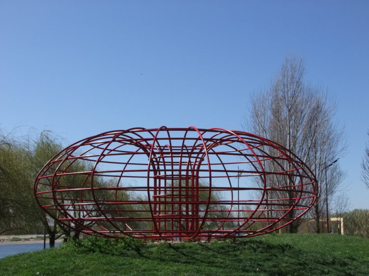 Still in the realm of leisure and daily life, and that of time and local history, Cristina Ataíde created Rotter (2010-12), a sort of fish-trap used for traditional freshwater fishing. The simple act of enlarging the object places it in a dimension that is not only conceptual but also physical since it allows the body to enter it. Placed on a small embankment near the river, the trap is not intended for regional fishing but for humans, who can easily fit in the sculpture at this scale, held up by the red color that contrasts sharply with the green neutrality of the lawn and of the row of willows that weep above the river, and by the seemingly imprisonment of the body, as if it had been sucked inside this large toroid shape.