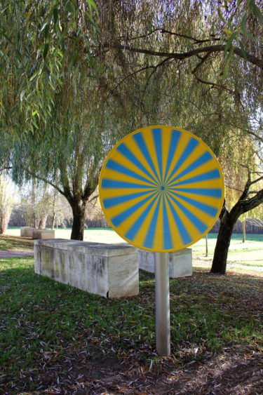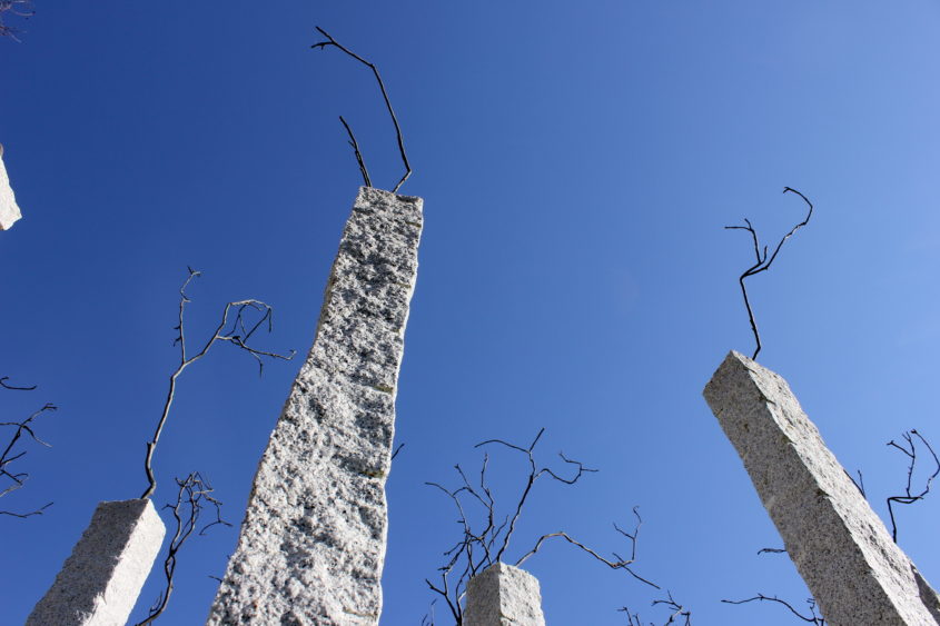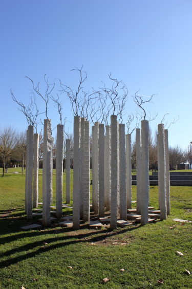 Next to a mirror of water, on the saturated green of the lawn, Carneiro sets up a series of granite columns, installed in concentric circles. Imagine a forest of hard trunks of granite, placed along several rings of different diameters. Once inside, the visitor immediately captures its mystical, cardinal composition that greets the elementary nature of the universe. To enter this sculpture, to observe the landscape through its now mineral trunks, is to establish an immediate, “nirvanesque” link with the cosmos. To the “west”, “earth” equals “life” equals “art”. To the “north”, “water” also equals “art” also equals “life”.