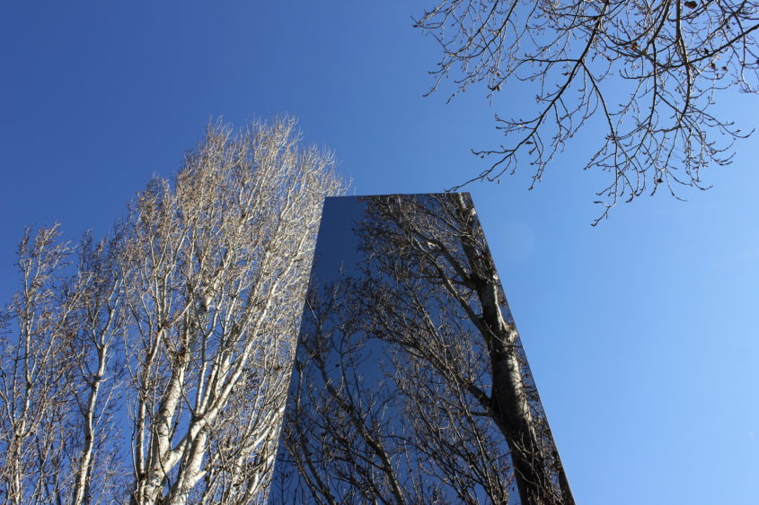 Zulmiro de Carvalho, with Linha da terra e do rio (Line of the Earth and of the River) (2012) and Fernanda Fragateiro with Concrete Poem (2012) call upon the poetry of the line and of drawing. If in the first work the line is constructive, indicating and highlighting the line of water and earth drawn by the river and its banks, in the second one it is the tool that allows a reflection on the act of constructing itself. The line is therefore an architectural element that defines spaces, places and landscape. Also intimately interacting with the language of architecture, Carlos Nogueira offers Casa quadrada com árvore dentro (Square House Containing a Tree) (2012). The sculpture is almost of an emanation of philosopher Gaston Bachelard’s work, where the different poems and verses on the nature of space (welcoming and expansive, material and immaterial, physical and metaphysical) resonate. A concrete structure emerges from the ground to protect and enclose a tree. The human body gives way to the vegetal body for the almost timeless duration of art. The space is formed in relation to the tree and not to human whims. In S/ Título (Untitled) (2012), José Pedro Croft reflects on the dematerialization of the landscape and the reflection as the possibility of another landscape and urban reality. Four long vertical mirrors are installed in the continuity of the Tagus, with slight orientation distortions. The landscape is reconstructed by the reflection, revealing new dimensions and concealing others – a gigantic play on appearances, illusions and re-creation.