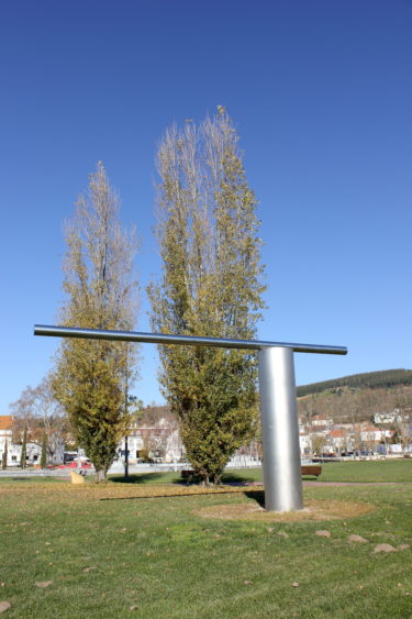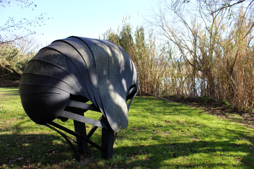 Along the edge of reeds, close to the river, a strange creature curls upon itself, turning its back to the world, indifferent to everything. Rui Chafes’s Contramundo is exhaustion by weight, the unbearable weight that seeks out relief or salvation in isolation. Unnamable, indescribable, this black, powerful creature with organic shapes is the synthesis of all of Chafes’s work: between gravity and lightness, fall and asceticism, Contramundo is also the body that comforts by its peacefulness and by the affirmation of a gesture that surrenders to absence. In fact, no other work can better crown this vaguely peripatetic, exhausting journey, in a park which architectural and landscaping nature does not go against the site where it is located but offers encounters with some stunning examples of public sculptures that, in turn, sublimate the landscape, stretch the time and the space in which they are embedded, at times playful, contemplative or reflective. An exhibition, at last, that features some of the most important names of contemporary Portuguese sculpture.