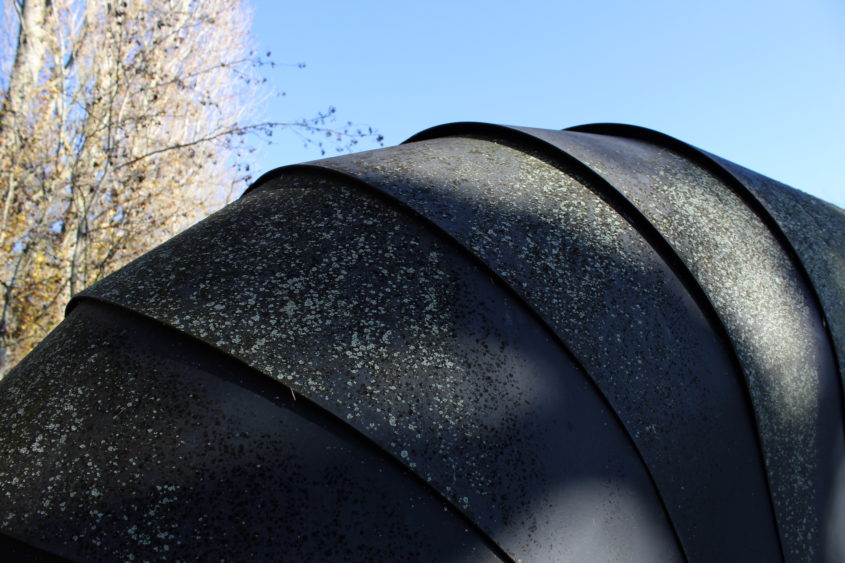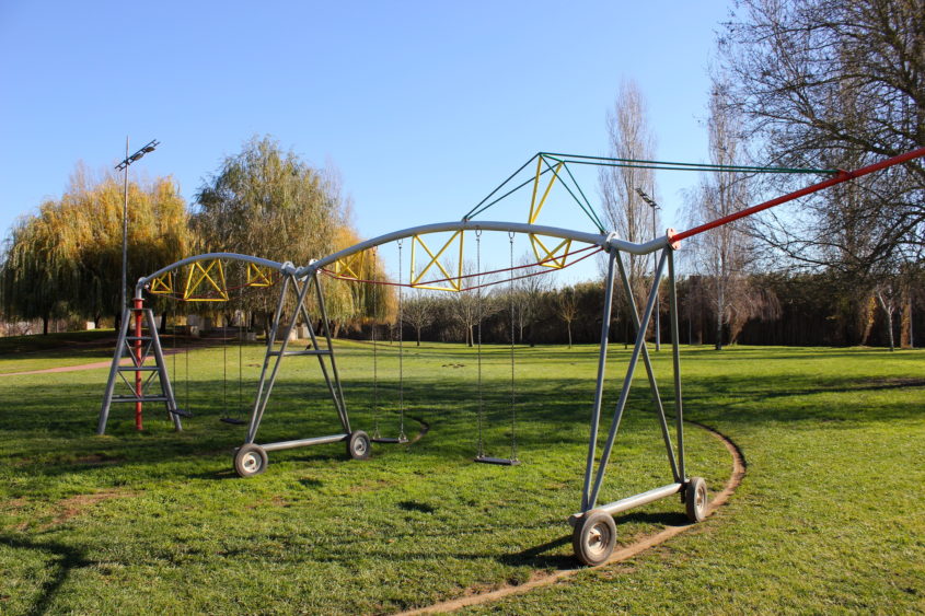 A little further, Ângela Fereira conceived Rega (Sprinkle) (2012) as an interactive object. This utilitarian work refers to industrial and mechanized sprinklers while serving as a swing for children to play. The artist plays with the language of associative memory to bring industrial objects in the realm of art. The visitor wonders whether the piece is a work of art, a practical object, or if these questions have any relevance and if Ferreira simply created something radically intuitive, immediate, and genuinely unpretentious.