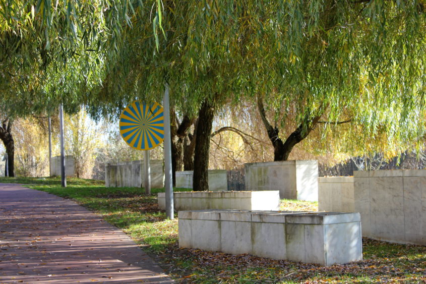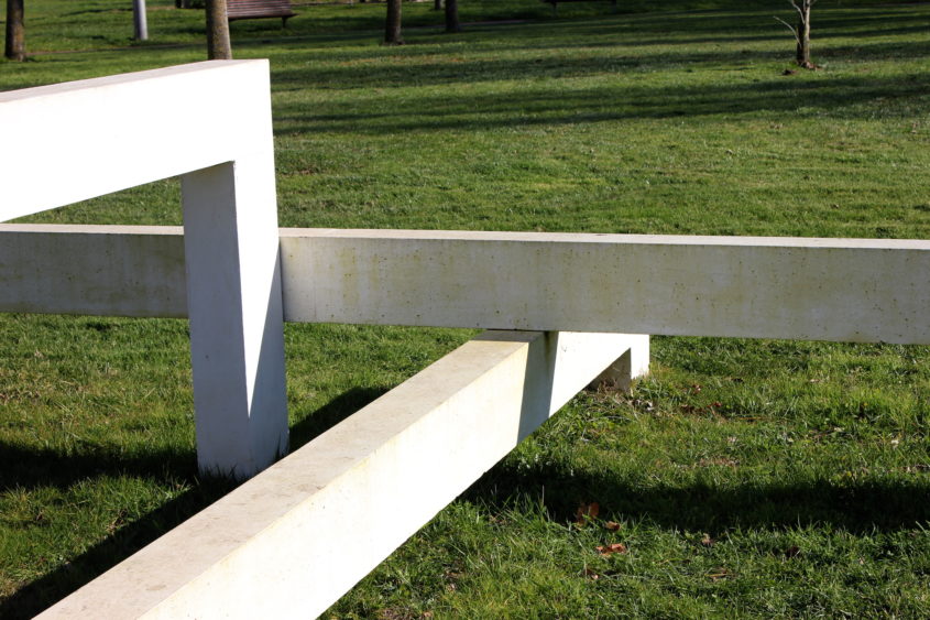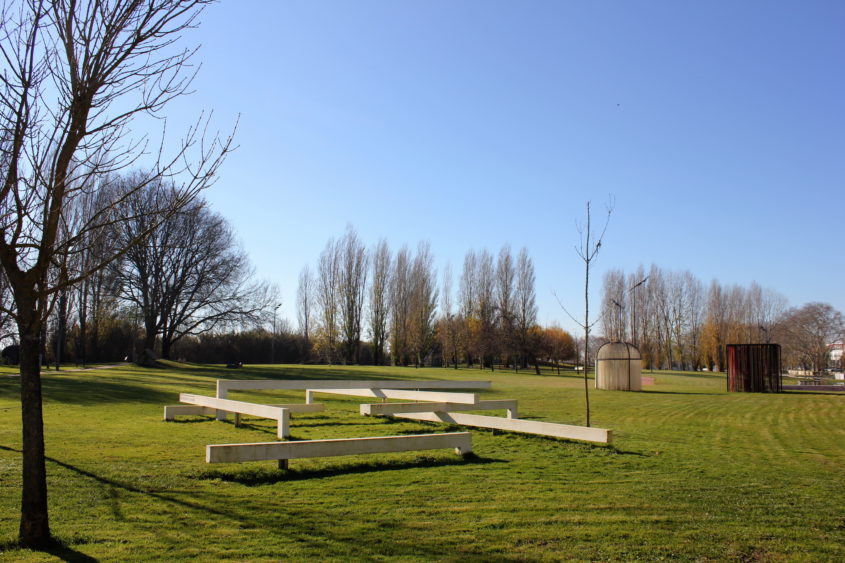 Oddly enough, in a country dominated by its capital city Lisbon, one needs to go to Vila Nova da Barquinha, quite far from the cultural center, to discover one of the most interesting and accomplished experiences of contemporary public sculpture in Portugal. The only things that connects these two municipalities is the Tagus, a polluted, murky river that carries contempt for capitalism and for environmental neoliberalism while still remaining the structuring element of a region and of a landscape that were built in unison. It is precisely on the banks of this dark line of water that the Almourol Contemporary Sculpture Park (designed by landscape architects Hipólito Bettencourt and Joana Sena Rego) was created, not just to contain the occasional flooding of the city, but also to allow a truly democratic artistic project that would be mindful of the playful yet contemplative nature of a leisure park. There are no predefined paths here, but rather an attempt to translate a nomadic exercise and an experience (one could describe it as phenomenological, not reductive but expansive) within the landscape. The park is an invitation to wander, meander and daydream. However, the work of Alberto Carneiro, Sobre a floresta (On the Forest) (2012), stands at the entrance of the park, because of the central role of Carneiro in the contemporary artistic landscape of Portugal and of his approach that combines this double nature of art in public parks: playful and contemplative, even spiritual.