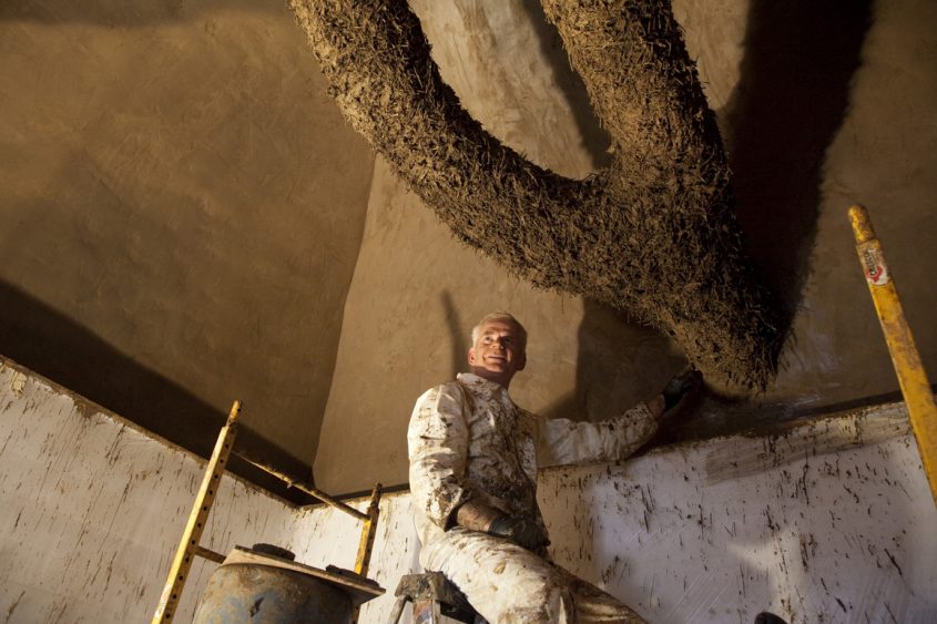 On the other end of the park sits the Presidio Officers’ Club, one of the oldest buildings in the Presidio. When the U.S. occupied the site in the 1840s, they built upon the existing structure. Further renovations took place in the 1880s, 1930s, and 1970s. In 2011, the Presidio Trust began a rehabilitation project to preserve historical features of the club and meet contemporary building standards. This excavation revealed centuries-old adobe walls buried behind layers of more modern ones. The Officers’ Club reopened in 2014 as a museum, and Goldsworthy returned to create Earth Wall. The artist built a six-foot-wide half-sphere from curved eucalyptus branches and then buried it in an outdoor earthen wall at the Officers’ Club. Referencing the building’s renovation as well as other ongoing archeological digs at the park, Goldsworthy partially excavated the half-sphere, exposing it to viewers while keeping it embedded in the wall.