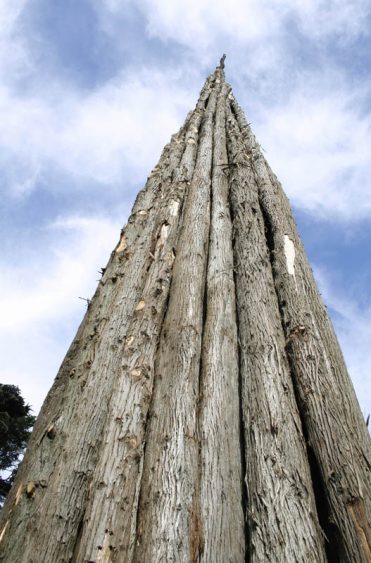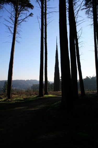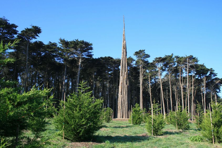 Because 100 000 trees of the forest were planted within only a couple of decades, the trees have aged together. Many trees, especially Monterey cypress and pine, have started to die off together. Spire (2008) is a 100-foot-tall totem dedicated to and comprised of thirty-seven aged cypress trees. The wooden obelisk tapers to a point that can be seen through the canopy from a nearby road. With an eye towards the future of the forest, Goldsworthy planted several young cypresses, which will grow to engulf Spire.