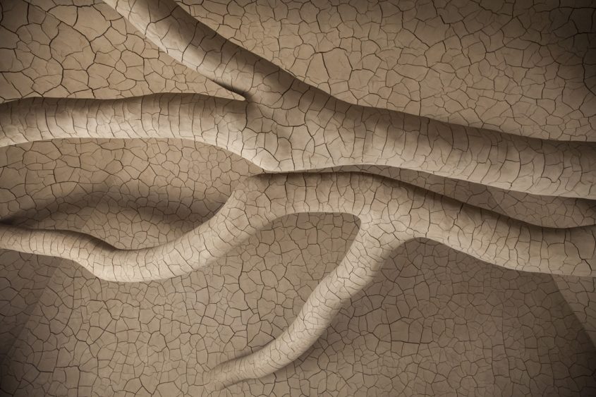 Three of these works were created in partnership with the FOR-SITE Foundation between 2008 and 2013. Tree Fall (2013) occupies the interior of a historic building that originally housed gunpowder. Goldsworthy coated a felled eucalyptus tree from elsewhere in the park with local clay and installed the tree in the dome of the powder house. The clay the surrounds the tree and covers the dome ceiling is cracked like a dry lakebed under a scorching sun. Eucalyptus is a distinctive constituent of the 300-acre Presidio Forest, but it is also one of California’s most notorious invasive species, brought to the state by Australians during the Gold Rush. The clay references another invasion of the landscape—that of the Spanish military, who occupied the site in 1776, displacing Ohlone people from the grassy scrubland hills. The first buildings the Spanish constructed were made of adobe, which was likely composed of the same clay Goldsworthy used in Tree Fall.