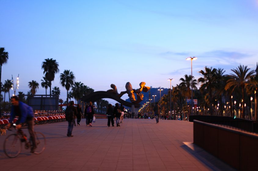 Installed around the Old Harbor while this urban area was redesigned, the Cara de Barcelona is a feminine face, a flame or maybe a paintbrush, depending on your perspective and on the light surrounding it. We met with it at sunset and the reflections of the nightlights on the tiles were stunning!