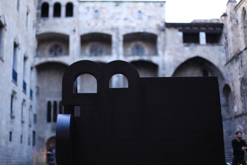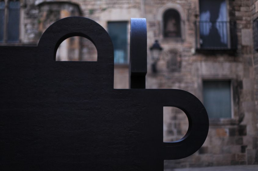 In the heart of Barri Gótic, this work of art was purchased by the city of Barcelona in 1986 and then installed on Plaça del Rei according to the artist’s will. The medieval setting, the colors and the textures of the surrounding buildings (shades of brown, grey and black), and the window openings all contribute to a constant dialogue between the sculpture and its environment. Furthermore, the open shape of the sculpture allows people to sit and nest into it. An invitation to gaze elsewhere.,,