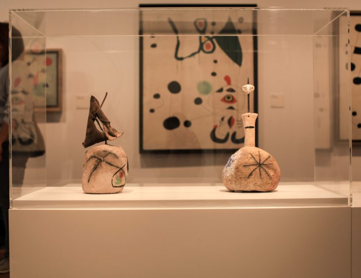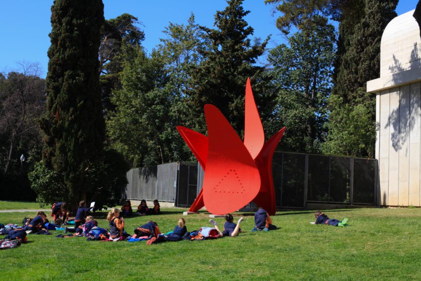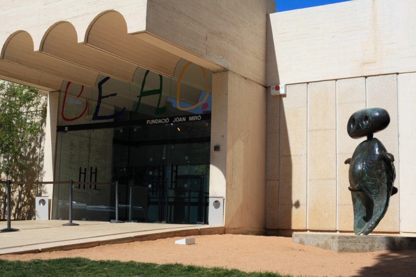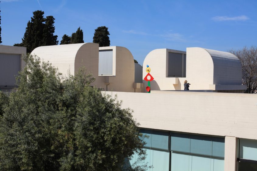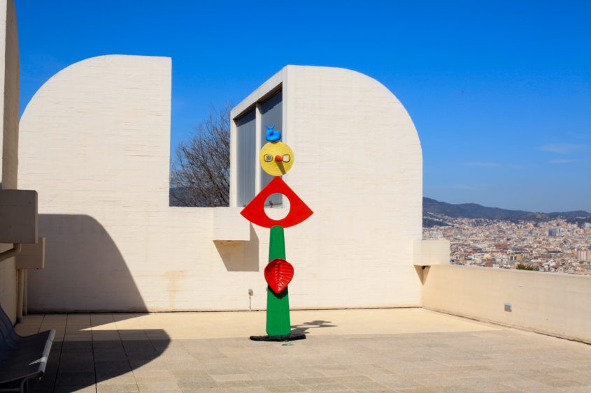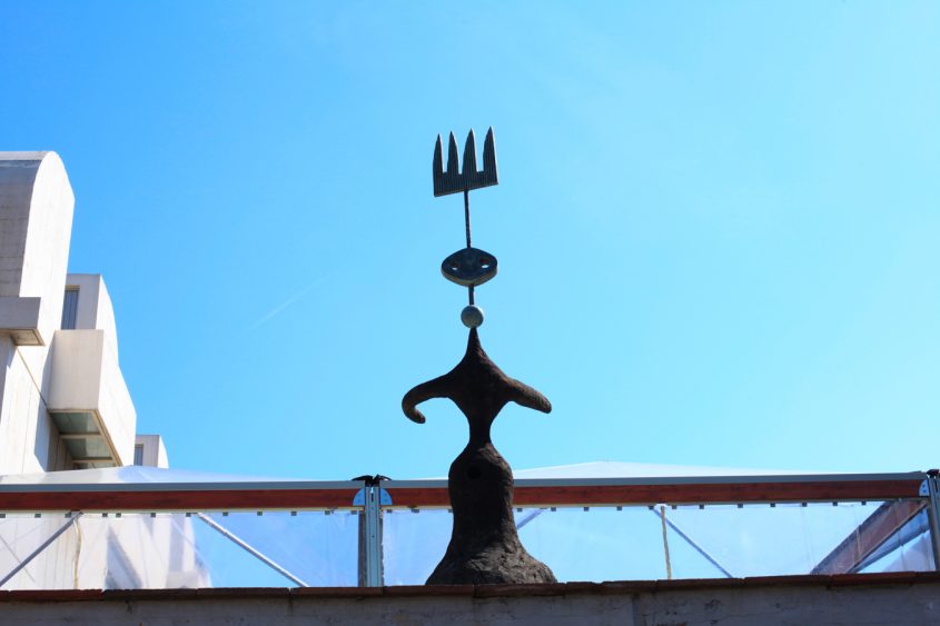 The Miró Foundation is undoubtedly an architectural gem that requires to be visited. Built by architect and urbanist Josep Lluis Sert, Miró’s Catalan friend, the building is reminiscent of the Maeght Foundation in Saint-Paul-de-Vence in France, which was built by Sert a few years earlier. Wide bright spaces and numerous openings on the exterior make this three-levels building easy to navigate. Miró’s work is displayed chronologically, starting on the ground floor and ending on the terrace. The use of materials such as white cement and red clay gives this Mediterranean architecture a particularly intimate and warm feel. The works, and in particular the sculptures, occupy the site as though they were born there. But it is once you step out onto the terrace where you are flooded by the light that you can truly enjoy altogether the splendor of the architectural work, the spectacular city views and the outdoor sculptures. While the sculptures like to play hide and seek because of their strategic placements within the space, visitors can take a rest, observe and dream, maybe. This is a place for contemplation, where architecture, sculpture and nature brilliantly come together.