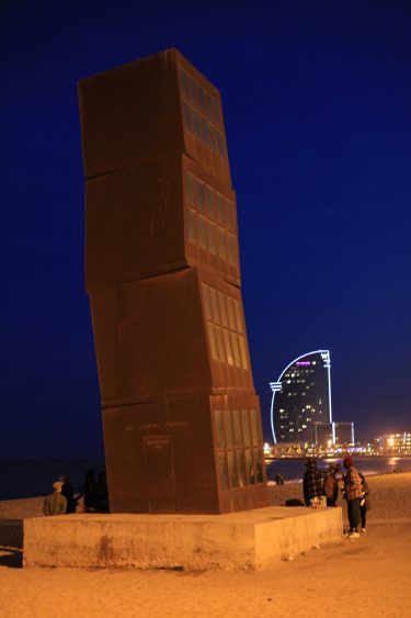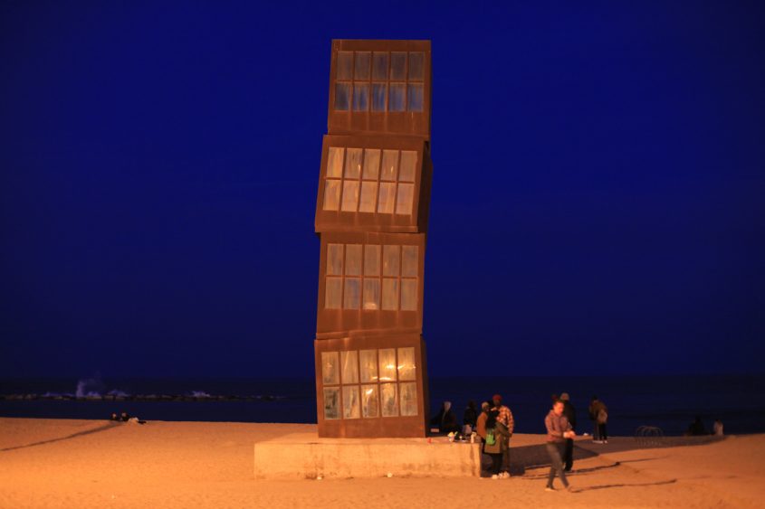 Appelée « els cubs » (« les cubes » en français) par les barcelonais, la sculpture de Rebecca Horn est devenue un point de rendez-vous pour les touristes et les locaux qui se promènent le long de la plage. Composée de quatre cubes d’acier vides, empilés d’une façon faussement approximative, la sculpture qui s’élève à 10 mètres de hauteur, est facilement repérable. Commandée dans le cadre de la réhabilitation du quartier de la Barceloneta pour les Jeux Olympiques de 1992, L’estel ferit veut rendre hommage au passé du quartier de pêcheurs, anciennement caractérisé par les baraques-restaurants (xiringuitos) installés sur la plage, qui rappellent les cubes de la sculpture. Barcelonans call it “els cubs” (“the cubes” in English). This sculpture by Rebecca Horn has become a meeting point for tourists and locals strolling along the beach. Composed of four hollow metal cubes that are deliberately oddly stacked, the 32-feet-high sculpture is easy to spot. Commissioned during the rehabilitation of the Barceloneta neighborhood for the 1992 Olympic Games, L’estel ferit is meant to honor this fishermen neighborhood’s past, which used to be characterized by beach restaurants (xiringuitos) set up on the beach, evoked by the cubes of the sculpture.