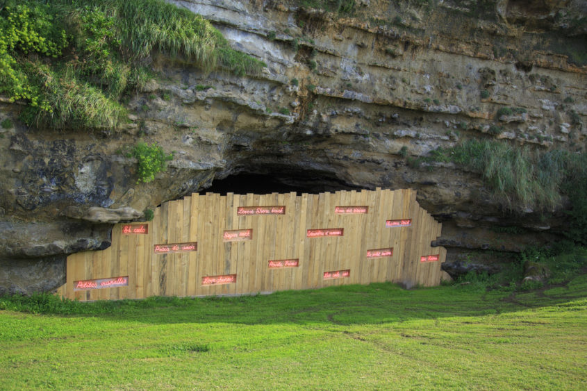 Artist Lionel Scoccimarro blocks the access and visibility of this legendary cave with his Love Palissade: a palisade made of light wood (80’s surf shop aesthetic) onto which are attached red neon lights (timeless sex shop aesthetic) listing surfing spots with evocative names: “Praia do amor”, “Petites mamelles”, “Baie des sirens”, “Pleasure Point”, “Les culs nus” … Scoccimarro plays with the idea of a lovers’ meeting place, secret or discreet, and with the ambivalence of the palisade, which all together protects and signals the entrance of the cave.