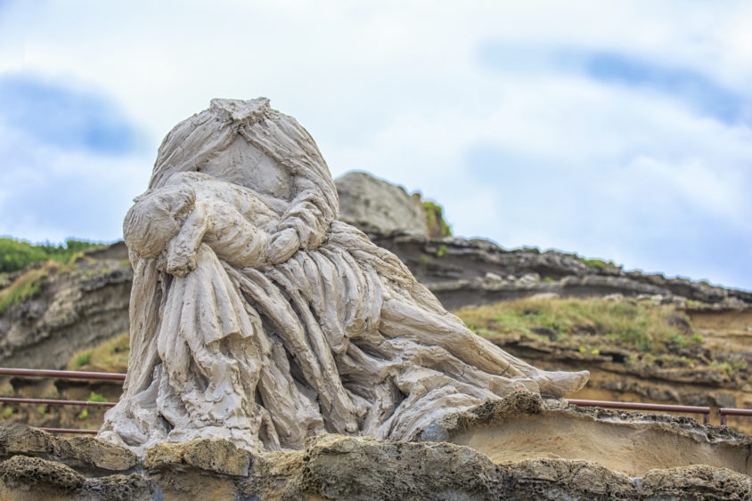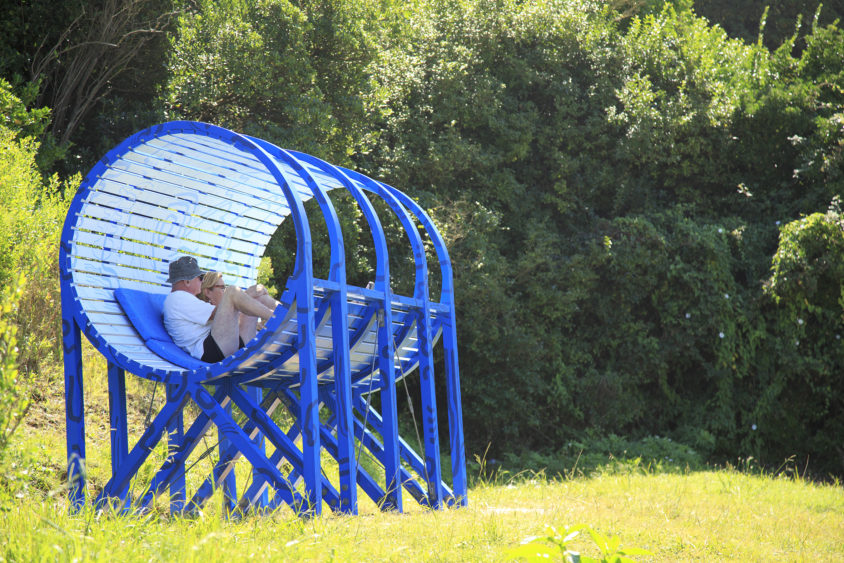 The artworks come one after the other along the itinerary: proposals that evoke feminity, ideals and seduction (Love is the air by Stéphane Pencréac’h; Quando vedrete moi caro amore by Madeleine Berkhemer), artwork-furniture, calling for closeness (Is it you looking for me by Bernhard Martin; A structure for sharing by Jay Nelson & Rachel Kaye), sculptures that celebrate the multiplicity of the feelings of love (June by Jérémy Demester; La Copula by Remed; Invalid Icon (Anglet) by Anne Wenzel). German artist Anne Wenzel created an earthen reinterpretation of La Pieta, beheaded, compassionate figure. From the trail, one can only see the back of La Pieta. She is facing the ocean, just like Friedrich’s character. The gaze follows that of the sculpture and is carried toward the horizon.