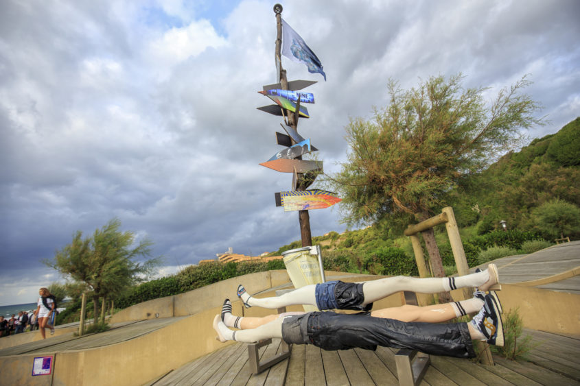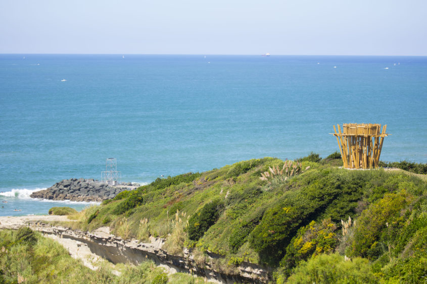 Atop the Love Tower built for the occasion by Japanese artist Tadashi Kawamata, spectators can gaze at the Atlantic, beaches and rocks of the Chambre d’Amour. Facing them, the immensity, at times luminous and serene, at times tormented and stormy, is ever changing. Love and ocean: an easy but effective metaphor. This 13-foot-high wooden tower, crowned with a large deck (to observe, or to encounter love…) is located just above a cave named “La Chambre d’amour” (the love chamber) after an 18th century Basque legend – the story of two lovers led to a tragic end by thwarted love. The legend became the underlying thread of this edition imagined by Richard Leydier.