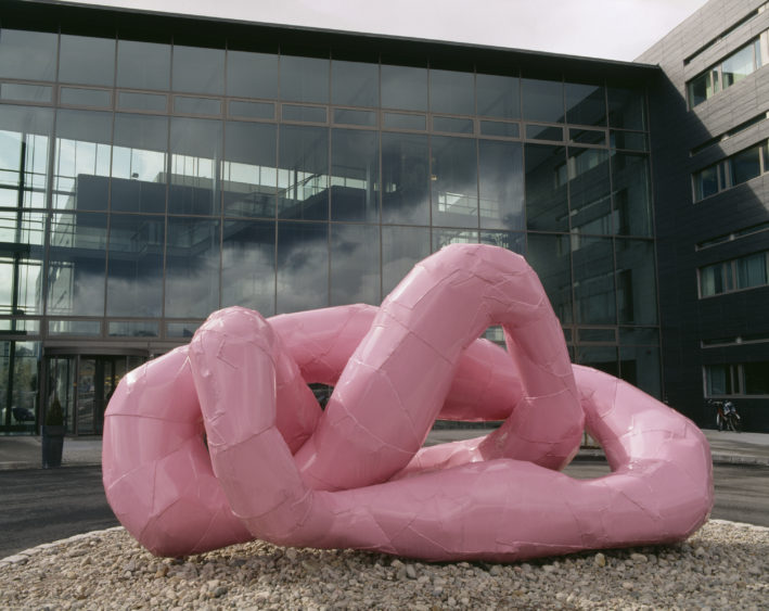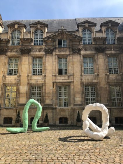 The fantastic retrospective on Austrian artist Franz West (who passed away in 2012), presented by the Pompidou Center in Paris since the beginning of September, is making its way out of the museum. A selection of some of his monumental outdoor works have taken over the Marais in several of the neighborhood’s museums and institutions. Kugel (2006), a spherical aluminum sculpture, is installed in the garden of the Picasso Museum, while the Cognac-Jay Museum hosts in its courtyard Ohne Titel (2008-2009), a late work that synthesizes Franz West’s plastic research on shapes as well as on materials, surfaces and colors. As for Omega (2008) and Meeting Point (2010), two gigantic monochrome “sausages”, a white one and the other green, they are displayed in the courtyard of the Historical Library of Paris in the hôtel Lamoignon. Finally, a fifth monumental sculpture by Franz West is installed in the main lobby of the Pompidou Center.