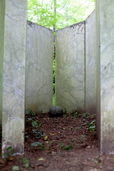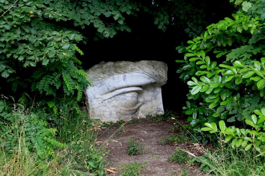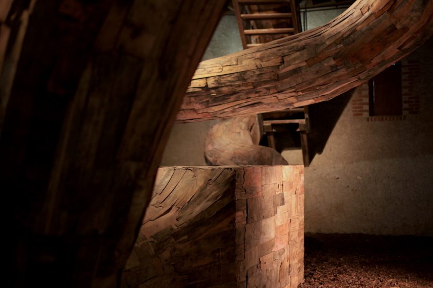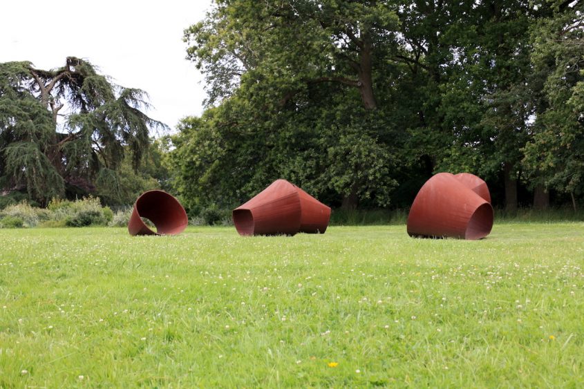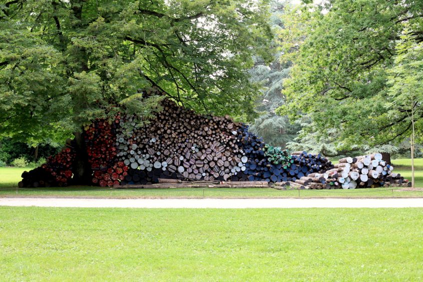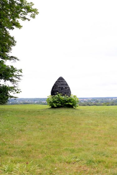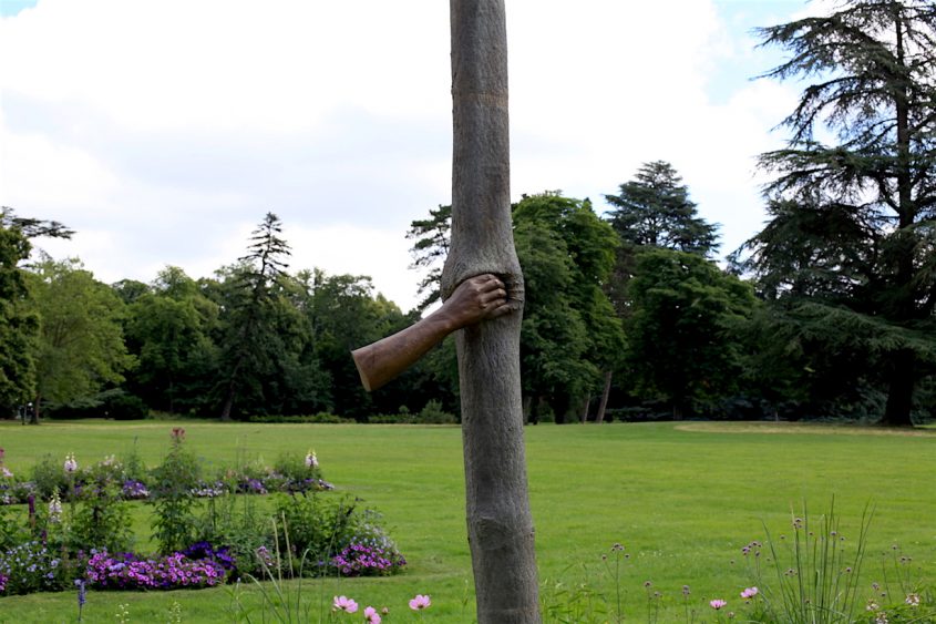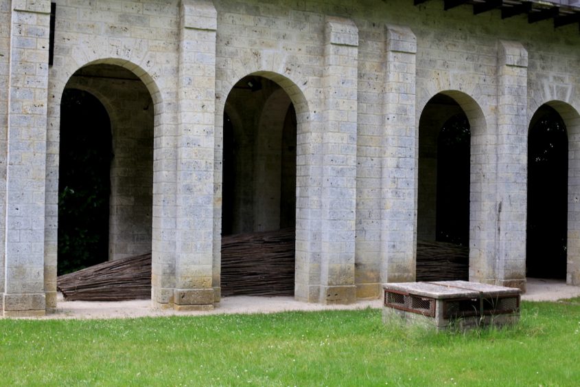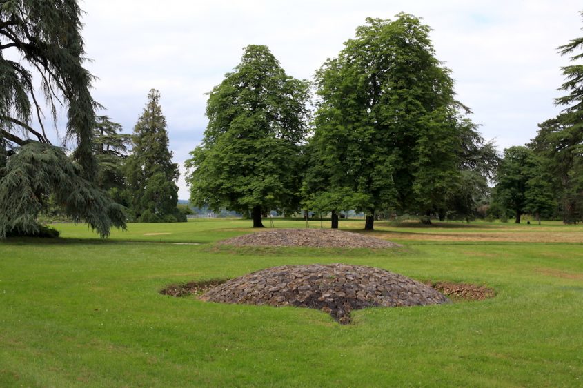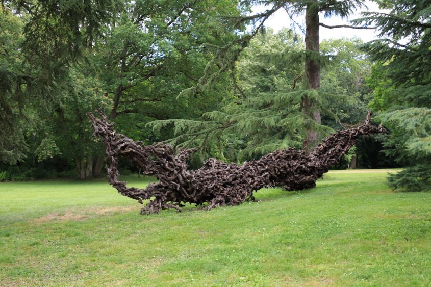 I start with the Historical Park and its winding alleys leading me from one sculpture to the next. Among all the outdoor artwork, my favorite probably is Lieu de rêve, a sculpture by Anne and Patrick Poirier (2010). A few steps behind me stands Andy Goldsworthy’s “cairn”, specifically created for the 2016 artistic program. Since the first press release pictures, the artwork has slightly changed: the stump of the plane tree has started to grow and the base of the cairn is now surrounded by a vernal, sour green. It is impossible to remain indifferent to this part of the Domaine, which also includes Vincent Barré’s Chaos (2014), a sculpture composed of six cast iron elements which cut-out shapes redesign the landscape and reveal it in a new way. The binomial “sculpture nature” seems to have the most secretive bond with the mind. A silent communication is established, involving all senses. Sight, smell, hearing, touch… The entire body is solicited by a multitude of delicate, sometime imperceptible stimuli.