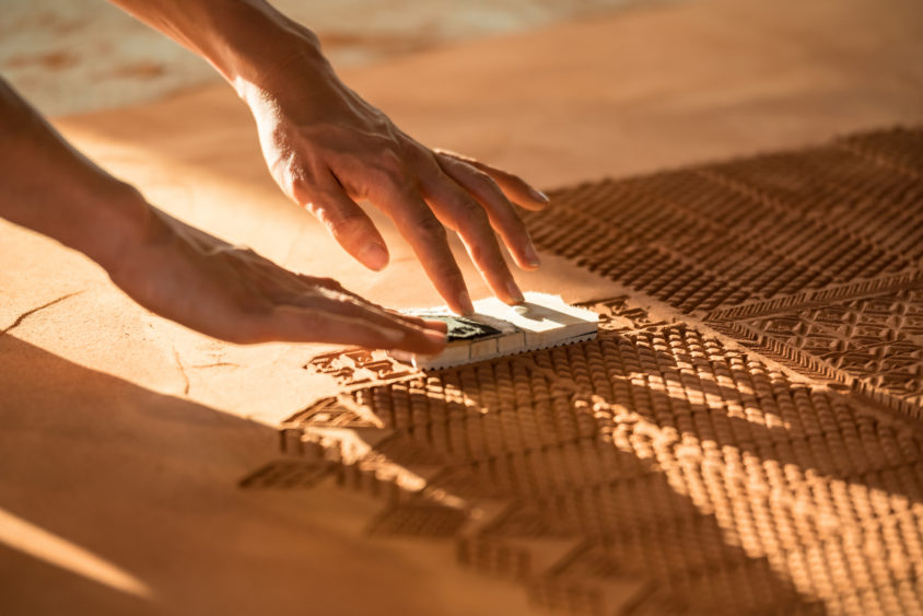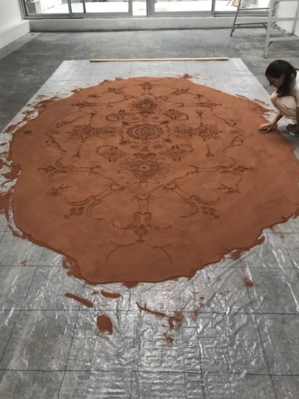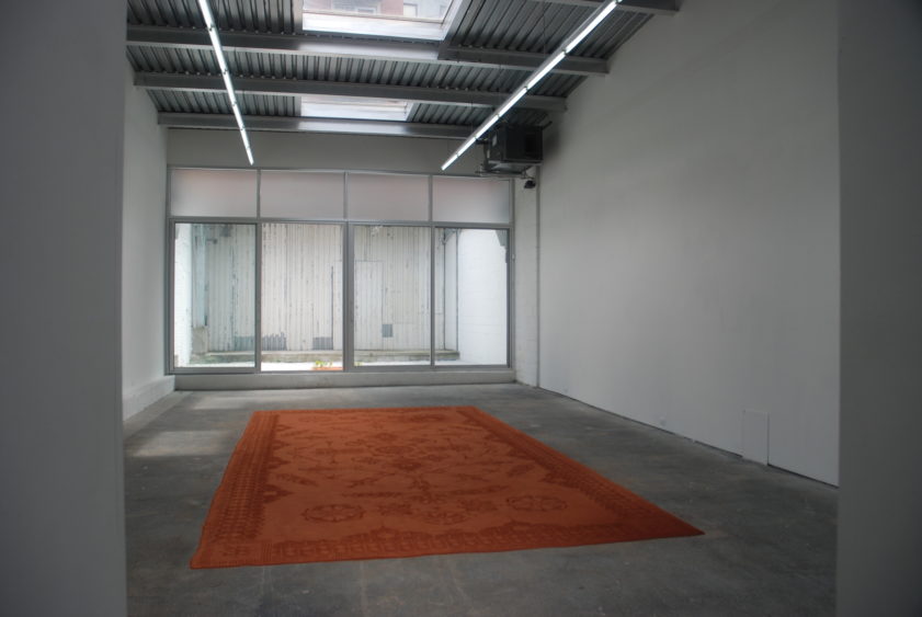 This inviting earthwork however sets up its own boundaries or rather alarms ever so subtly. A smooth surface that feels alive at the same time and its pressed patterns that follow human concepts such as geometry and symmetry is loaded with associations that imply various aspect of our society’s past and present. The rug, that is mainly associated with ceremonial purposes in the east and with luxury, comfort and status in western societies appears as a cover-up at the same time. What is hidden under Detrixhe’s Red Dirt Rug metaphorically is hard to capture exactly but the material and symbolism leads us to the ideas of land and its people – past, present and future -, and to history’s darkest hours of which we tend to not remember.