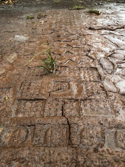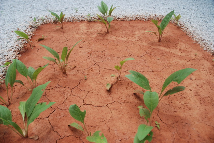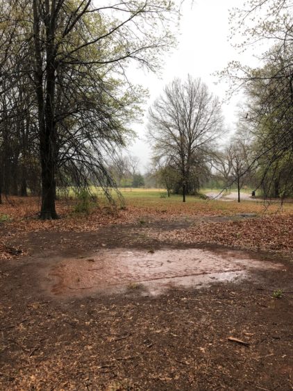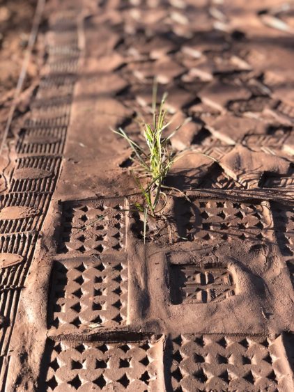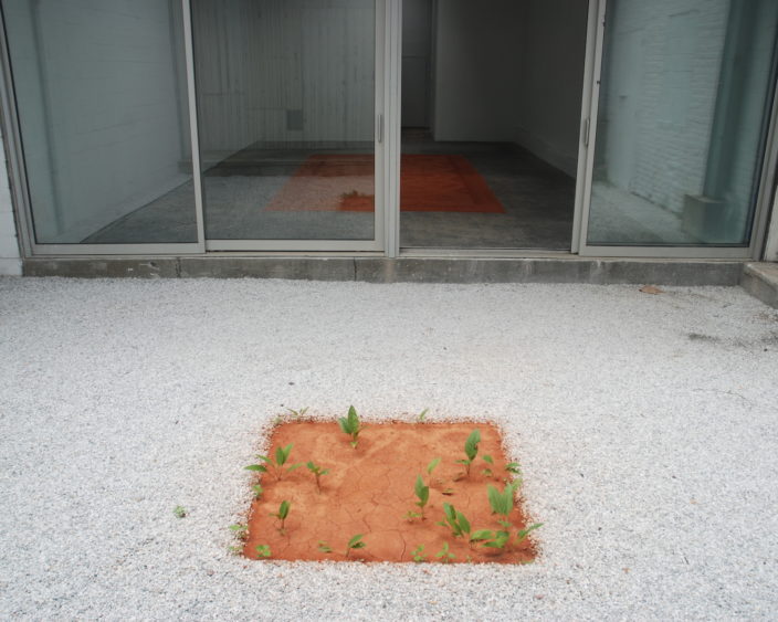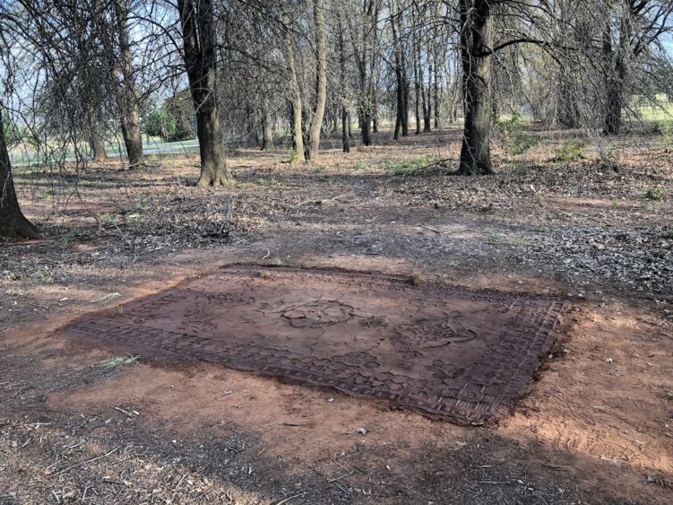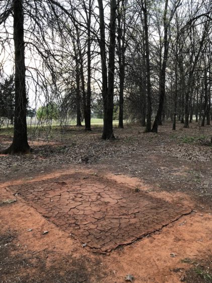 The source of the dirt is the land of the Dust Bowl, the end of the Trail of Tears which carries the heavy memories of multiple layers of hardship and human suffering. Such notions, seeped into the soil, carried over to Detrixhe’s artwork serving more like a humble memento than a monument to the transitory nature of things. Nothing else shows this clearer than an earlier outdoor iteration of the piece at the Botanical Garden of Oklahoma State University (Stillwater, Oklahoma). Executed last year and left to the elements of nature that eventually transformed it by turning it back to where it came from, Red Dirt Rug essentially emphasized one of our most basic existential experiences.