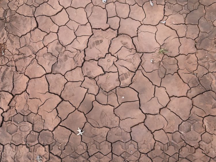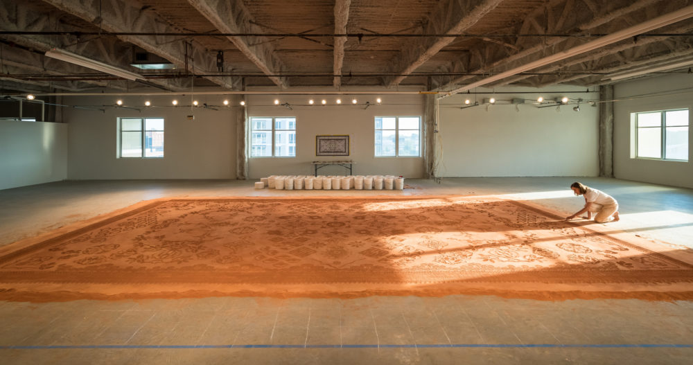 One aspect of the work that is strikingly obvious at first sight is the actual labor invested in its creation. It took Detrixhe a week to realize the current site-specific version of the piece on the gallery’s concrete floor. A careful and meticulous act done with great concentration and perseverance adding a performative aspect to the work. Imagining this meditative act, Diné (Navajo) sand paintings come to mind that, although from a different region, were historically made with similar reverence, patience and with the purpose of healing. And indeed the result of Detrixhe’s week-long action is a fragile and ephemeral piece that is in itself seem to transmit spiritual energies. In the earlier mentioned outdoor iteration of the piece, Detrixhe took several days to install the piece in the Botanical Garden of Oklahoma State University. “In the days following the installation, Stillwater was graced with a much needed heavy rain, thus beginning the process of erasing the pattern and returning the soil to the land.” – the artist reported. But while one might sense sorrow in the work, through its captivating beauty one also feels the possibility of a raised awareness, and through that of hope. Like tender yet resilient footsteps on the long rode of healing accompanied and washed off by the ever returning rain.
