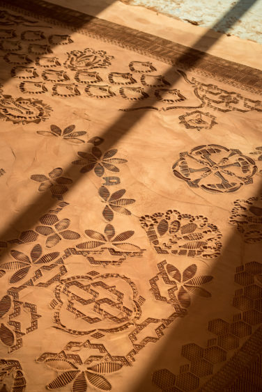 A deeply rich earthy red rug welcomes the visitors in the gallery space. It is made of red dirt collected from central Oklahoma, carefully sifted into a fine dust, layered and decorated by the artist Rena Detrixhe. Its hues and its material instantly evoke the Western, in this case particularly the midwestern, American landscape with all its ecological, spiritual and historical undertones. A soft, warm, organic material that according to the artist “symbolises grit, perseverance, sorrow, pain, spirit, resilience”.