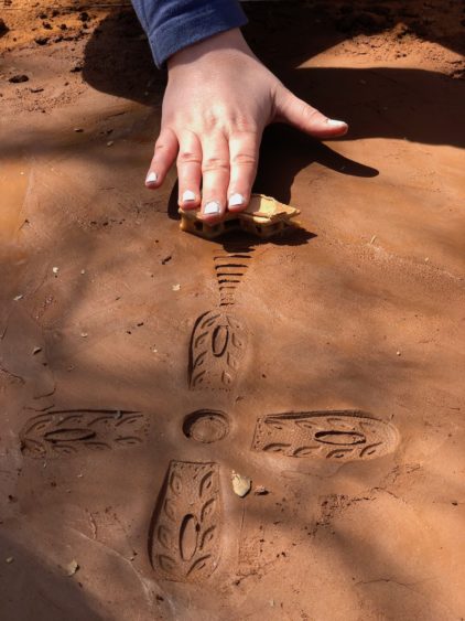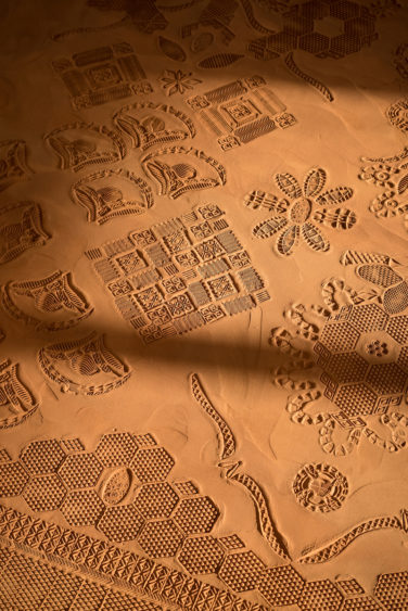 On it’s surface, Red Dirt Rug carries patterns of the midwestern landscape’s signature elements, such as cobs of corn, beehives, swallows, tractor tires and oil rigs all created by imprinting fragments cut from shoe soles. Carefully created marks that, when their origin is recognized, may mirror and even magnify not only the human presence, and the gesture of leaving a mark, but also our general ignorance to our footprint and its implications on the land and on future generations.