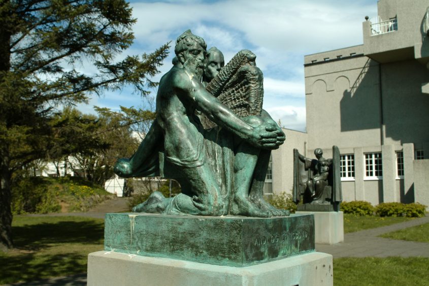 The city is also the home to three sculpture museums and gardens dedicated to individual artists. The statue of Jón Sigurðsson was created by Einar Jónsson (1874–1954), one of Iceland’s most prominent sculptors. The Einar Jónsson Museum sits next to Hallgrímskirkja, Reykjavík’s monumental modernist Lutheran church. Einar’s work is largely in a classical style indebted to Norse, Christian, and Greek mythology. Working from the late-nineteenth century through the 1950s, however, the increasing influence of modernism is evident in much of Einar’s work, with the appearance of abstract forms in many pieces. A leafy garden behind the castle-like museum showcases highlights from the artist’s oeuvre, such as Elli og Þór (Thor Wrestling with Age) (1939–40), depicting the young god grappling with the outstretched body of the personification of age drape of a dozen anonymous bodies.