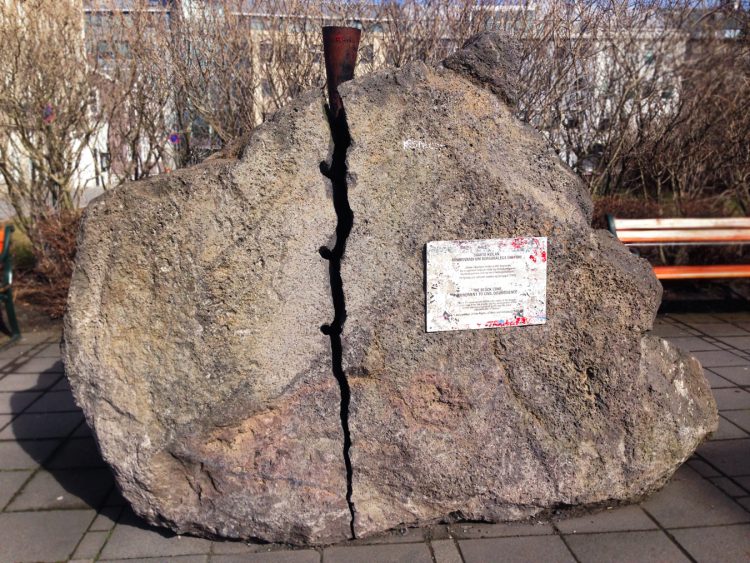 Iceland’s parliament, the oldest functioning legislative body in the world, currently meets in a small brick building in downtown Reykjavík. A towering statue of 19th century independence figure, Jón Sigurðsson, looks over the parliament house, Alþingishús, from a modest park across the street. This is the sort of nationalistic sculpture that is expected in front of government buildings, but even closer to Alþingishús is The Black Cone, Monument to Civil Disobedience (2012), a sculpture by Spanish artist Santiago Sierra (1966–) commemorating the 2008-09 anti-government protests held in the same park. The sculpture is a giant boulder cracked down the center by a small metal cone, which is meant to resemble the conical hats worn by individuals convicted by the Spanish Inquisition. Together, these sculptures are a reminder that both civic traditions and an active populace are the safeguards of democracy. Though the controversial placement of Sierra’s work pitted some members of Parliament against the Reykjavík Art Museum and the Reykjavík City Council, The Black Cone’s location illustrates the prominence of sculpture in Reykjavík.
