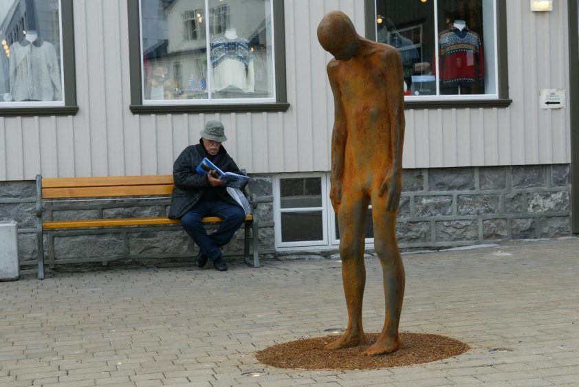 Notable works also include several by Steinunn Thórarinsdóttir (1955–), who is most well known for her life-sized, anonymous, and nude sculptures. Diverging a bit from this norm, Rætur (Roots) (2000), installed on the sidewalk of a busy shopping street, features on the torso and head of two such figures, who are encased in rectangular blocks of bronze. These subjects are like the inverse of the unknown bureaucrat, and though the two figures face each other, one gazes upwards and the other peers at the ground. They are incapable of moving as thousands of works, residents, and tourists buzz around them.