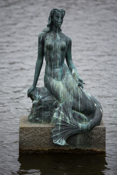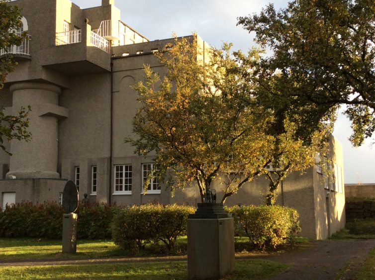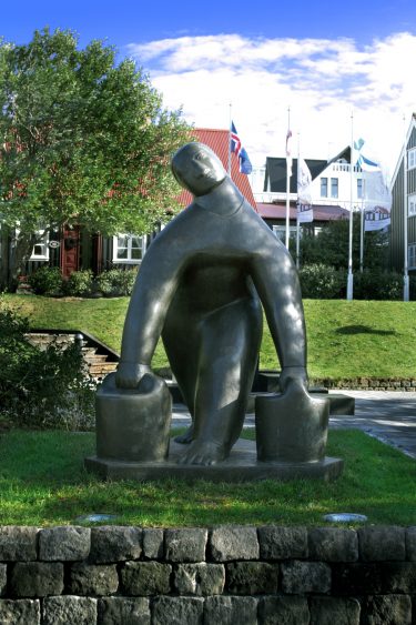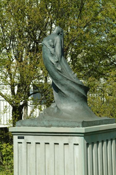 These three gardens are all worth visiting, but they leave viewers without an understanding of the significant contribution of Iceland’s many women sculptors. Much of this work can be seen around town, but in 2014, the city council also dedicated a portion of Hljómskálagarður park, on the southwest corner of Tjörnin lake, to the work of female sculptors. The most prominent work is Nína Sæmundsson’s (1892–1965) Hafmeyjan (Mermaid) (1948), a bronze mermaid on a pedestal submerged in the lake. Reminiscent of Edvard Eriksen’s famous The Little Mermaid (1913) in Copenhagen, the work alludes to both Iceland folklore and the Hans Christian Andersen story. This is a copy of the original that was blown up by vandals in 1960. þorbjörg Pálsdóttir’s (1919–2009) 1968 sculpture, Piltur og stúlka (Kata og Stebbi) [Boy and Girl (Kata and Stebbi)], is an excellent example of the artist’s unique contemporary style of roughly sculpture individuals with concave chests and faces.
