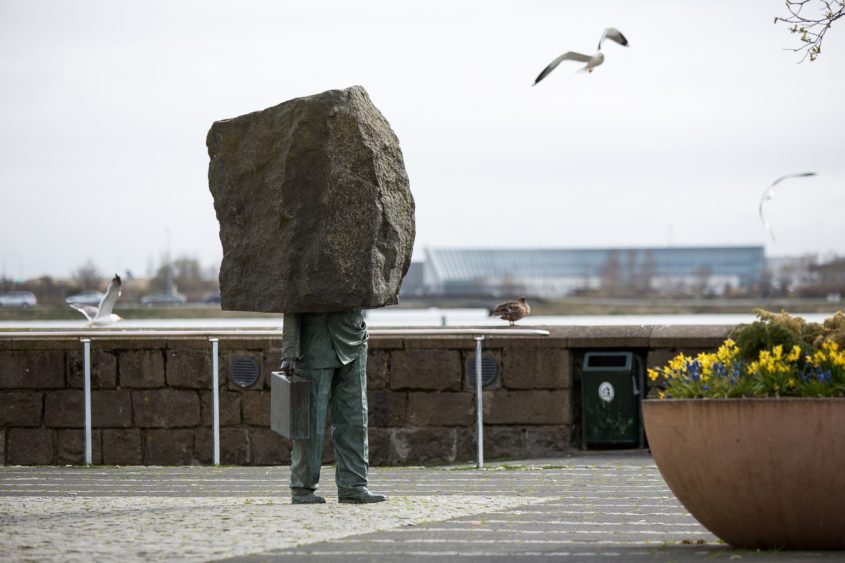 While the city’s various sculpture gardens present concentrations of work, often in stunning landscapes, the majority of sculptures are best viewed by exploring Reykjavík on foot. The Reykjavík Art Museum provides an interactive map documenting dozens of public works in their collection. Near the parliament house, on the north shore of Tjörnin, is one of the city’s most distinctive works, Magnús Tómasson’s (1943–) Minnisvarði um óþekkta embættismanninn (Monument to the Unknown Bureaucrat) (1993). In a more traditional style, the piece depicts the legs, torso, and arms of a man wearing a suit and holding a briefcase. His head, however, is entombed in an enormous chunk of unsculpted stone. The work succinctly sums up the experience of many office workers, weighed down by nebulous monolith, and many passersby openly identify with the nameless bureaucrat. Though situated on the picturesque Tjörnin, the man is fittingly walking in the direction of Reykjavík City Hall.