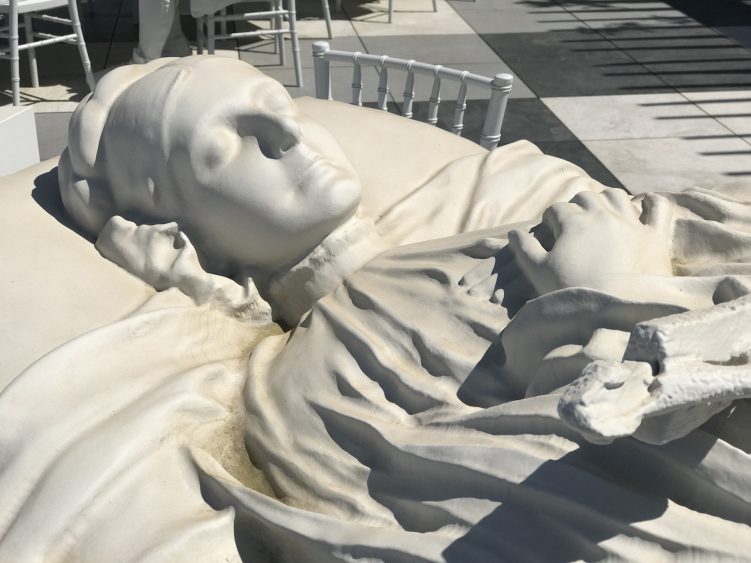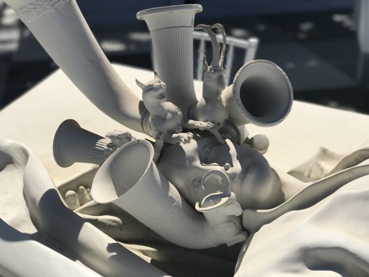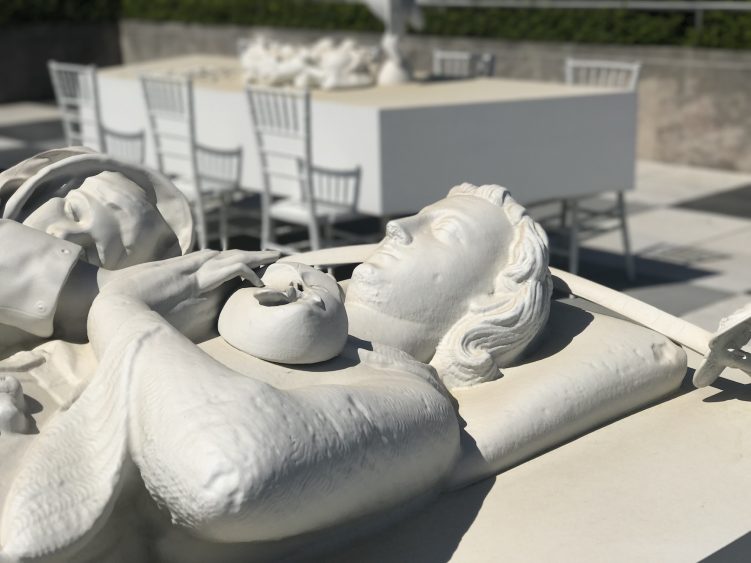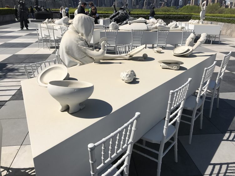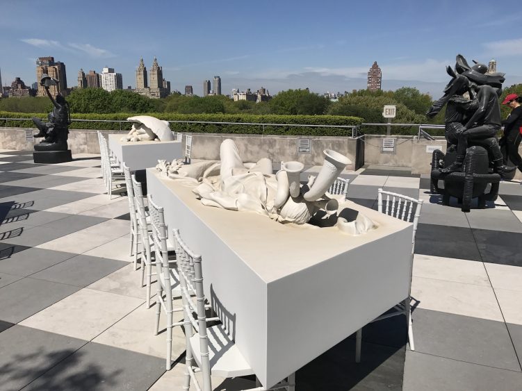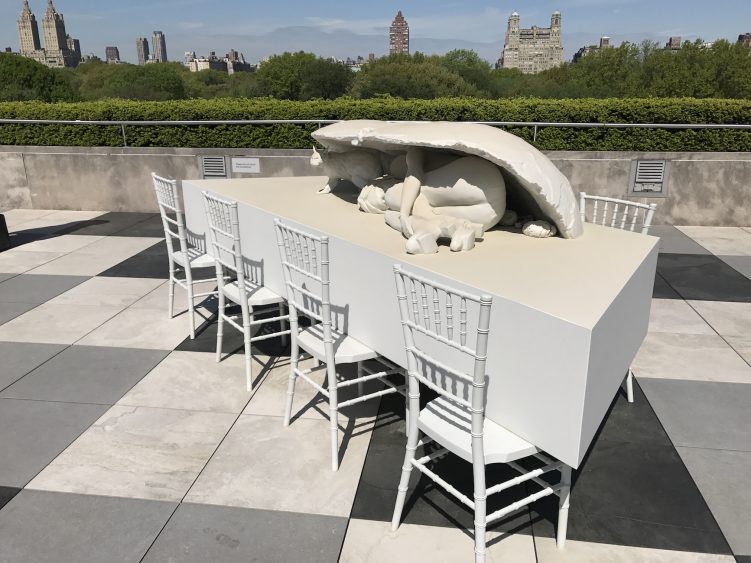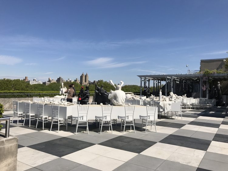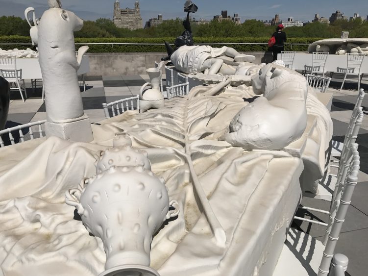 L’installation du MET se déploie sur la totalité de la terrasse et apparait comme un arrêt sur image en noir et blanc d’un banquet monumental. En étroite collaboration avec les conservateurs du musée, Villar Rojas a choisi des sculptures et objets provenants des différents départements du musée. Il les a ensuite réassemblés pour créer son installation composée de sculptures en mousse polyuréthane, recouvertes d’une couche de peinture matte blanche, noir ou grise. Animaux, poterie, vaisselle, nourriture, statues : chaque objet est décontextualisé et se mélange à toutes les époques.