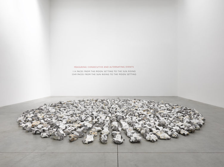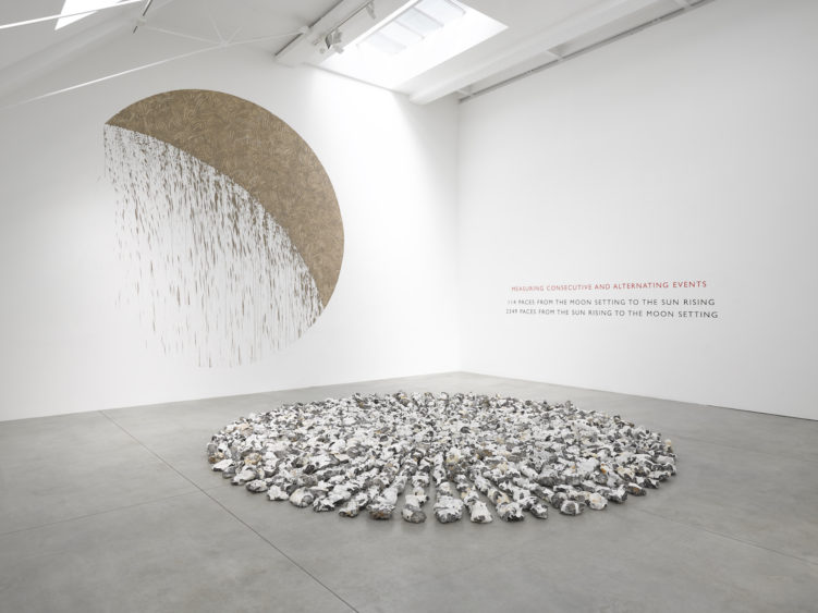 La galerie Lisson retrace l’usage du motif circulaire dans la pratique artistique de Richard Long depuis les débuts de sa carrière jusqu’à nos jours. Les archives de la galerie témoignent d’un premier cercle en pierre, appelé Stone Dance, dans un livre d’artiste dès 1971. Depuis le cercle a toujours été au cœur du travail de Richard Long, en pleine nature comme dans des espaces fermés. L’exposition se développe autour de Flint Wheel (2018), un cercle en silex installé à même le sol, et documente à travers des photos et des sculptures l’évolution son œuvre.