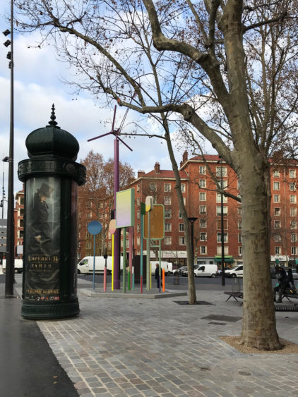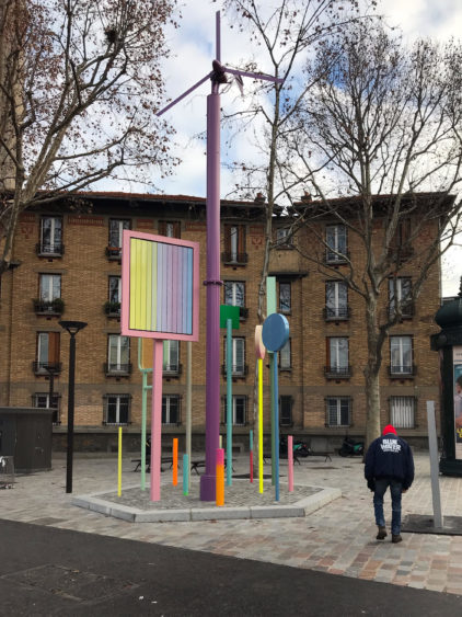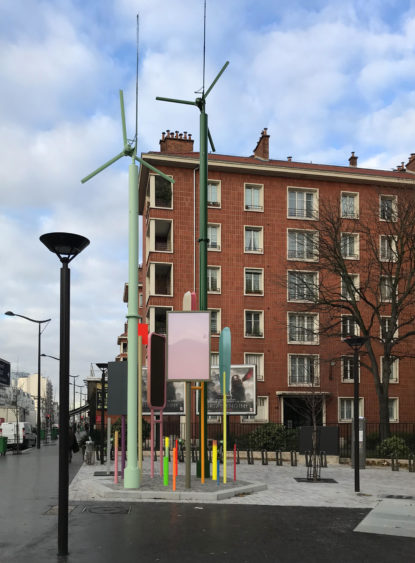 Inaugurée fin novembre dans le cadre du protocole des Nouveaux commanditaires, à l’occasion du prolongement de la ligne de tramway T3 à Paris, From Paris with Love de Bruno Peinado se compose de deux ensembles, à la croisée des 17ème et 18ème arrondissements, constitués de divers éléments de l’univers urbain – panneaux de signalétique, caissons lumineux, potelets – et d’éoliennes. Ces éléments sont transfigurés par des jeux de matières et de lumières, des couleurs vives, des messages lumineux en code morse et les mouvements des palmes des éoliennes. L’œuvre symbolise le souffle de renaissance et les variations d’émotions d’un quartier, de passants ou d’usagers de l’hôpital, en réponse au commanditaire de l’œuvre – un groupe du personnel de l’Hôpital Bichat-Claude Bernard, accompagnés d’un ancien patient.