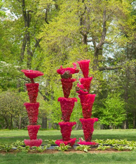 Pink Ladies (2014), un moulage de polyuréthane pigmenté et de bronze, se compose de trois piliers rose vif constitués de plusieurs cônes par lesquels circule l’eau. Benglis a choisi cette couleur après avoir vu un cerf volant planer dans le ciel d’Ahmedabad, en Inde, alors qu’elle participait à une résidence de six semaines chez la famille Sarabhai. Depuis, elle se rend régulièrement en Inde. La teinte rose vif contraste avec les gris et les bruns de la maison située derrière la sculpture, ainsi qu’avec les verts profonds de la pelouse et des feuillages. Comme toute fontaine, Pink Ladies sert de lieu de rencontre tout en constituant en soi une remarquable sculpture.