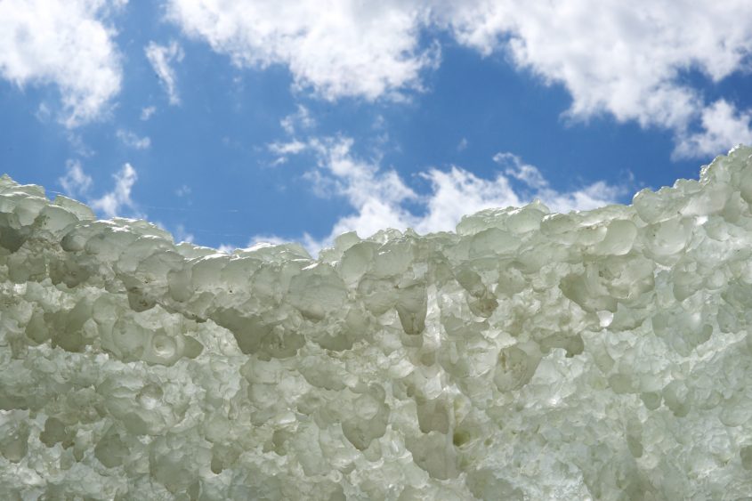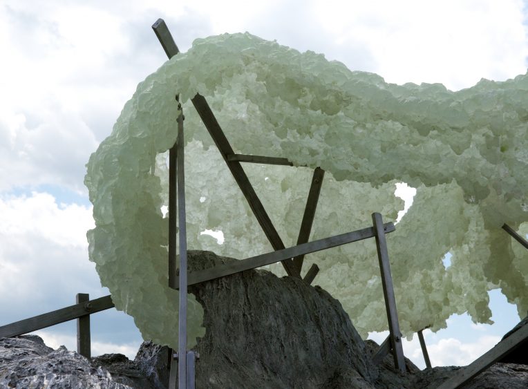 Hills and Clouds (2014) est la plus récente des œuvres de Benglis exposée ici. Ce n’est pas une fontaine mais plutôt un monticule—il n’y pas d’autre terme pour la décrire—de polyuréthane coulé soutenu par une structure d’acier inoxydable. Les éléments supérieurs de la sculpture et certains de ses éléments inférieurs sont phosphorescents. C’est en 1971 que Benglis utilise pour la première fois la phosphorescence dans son travail. Aujourd’hui encore, elle semble fascinée par ce phénomène naturel, que l’on peut observer dans les grottes et dans la mer. Dans cette œuvre en particulier, elle explique qu’elle souhaitait créer la sensation de quelque chose s’élevant dans les airs plutôt qu’ancré dans la terre. Les franges flottant le long des renflements en formes de hamacs rappellent quant à elles les longs filaments de mousse espagnole qui ornent les chênes verts de Louisiane, où Benglis est née. L’œuvre est un chef-d’œuvre de nature informe.