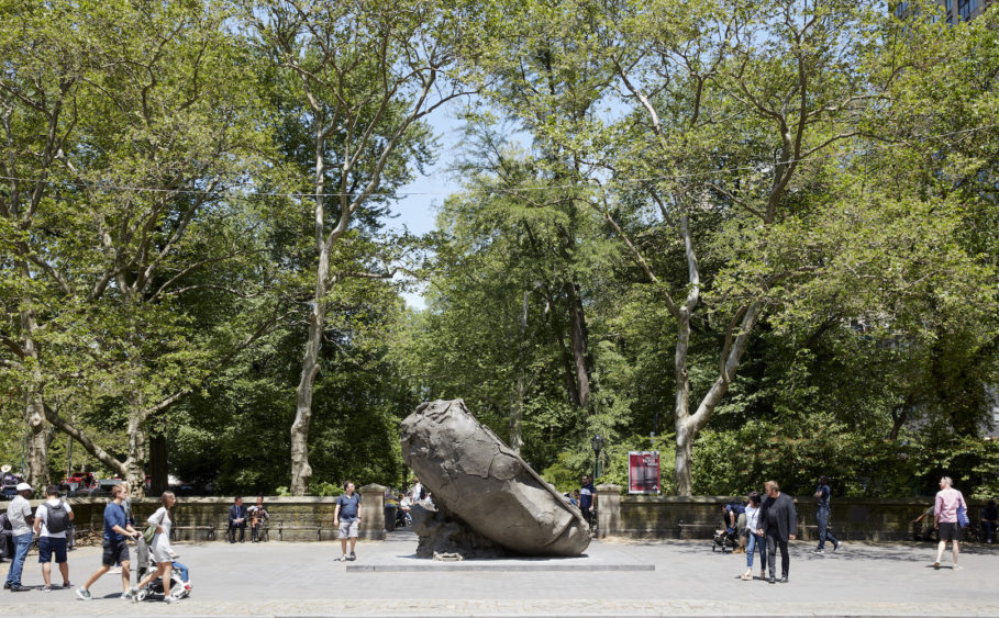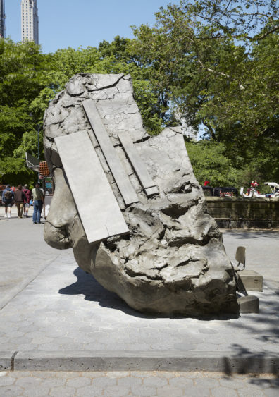 Placer une œuvre aussi compliquée au centre du midtown de New York, un lieu où se rencontrent commerces, tourisme, et même nature (Central Park), c’est risquer que l’art ne passe inaperçu ou qu’on lui manque de respect. Et effectivement, c’est bien le cas : quelqu’un avait laissé un verre en plastique à moitié plein sur la chaise insérée au dos de la Tilted Head de Manders. Ce type de mépris désinvolte mais délibéré semble tomber à point nommé dans le climat culturel actuel de New York, où l’art de qualité est dénigré au profit d’une scène bien plus crue. Quiconque se promène dans ce quartier se heurtera à l’anarchie de populations diverses et variées, friandes de ressentis immédiats, principalement sous la forme de nourriture et de boissons, plutôt qu’amatrices d’images sculpturales complexes aux références et aux implications obscures. Il se peut que Manders veuille jouer sur les deux tableaux : peut-être ressent-il la nécessité, pour un projet tel que celui-ci, de suggérer quelque chose se rapprochant de la grandeur ? Mais c’est en même temps un artiste qui travaille à une époque où la grandeur est clairement un désavantage esthétique et politique, déterminés que nous sommes à effacer tout privilège ou toute distinction historique. La notion même de se souvenir d’une personne semble donc impliquer un certain inconfort, une méfiance éthique visant la notion même d’accomplissement. C’est un contexte étrange pour créer de l’art, mais ce sont pourtant bien les circonstances culturelles actuelles de la pensée américaine.