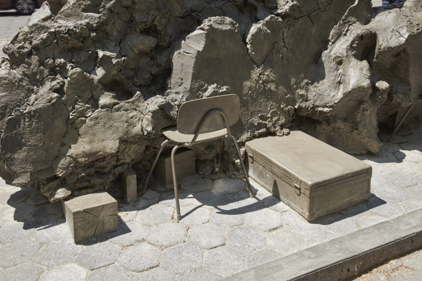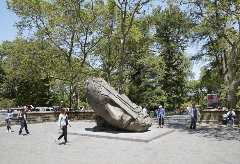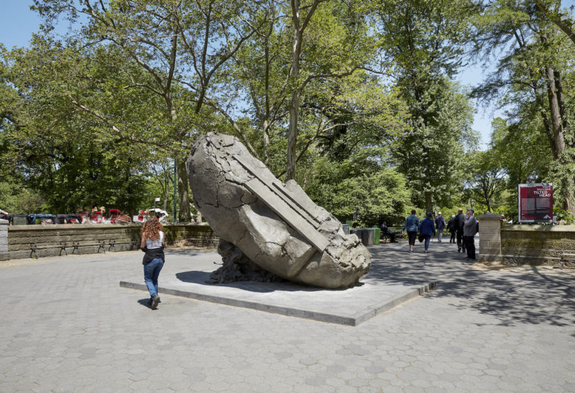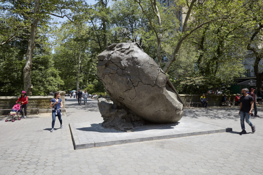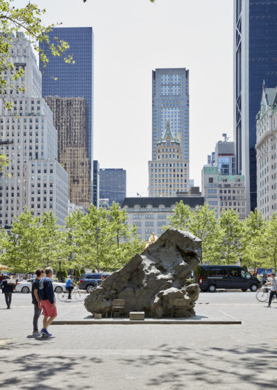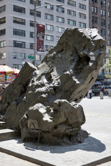 L’artiste néerlandais Mark Manders, âgé d’un peu plus de 50 ans, présente une tête monumentale au nord de la petite place située à l’intersection de la 60ème Rue et la 5ème Avenue à New York. Manders a construit sa réputation en Europe ; en 2013, il représente les Pays-Bas à la Biennale de Venise. Cette œuvre est formidablement mystérieuse. Elle consiste en une tête androgyne, tranchée d’un tiers sur le côté droit ; la tête tronquée semble reposer sur plusieurs planches de bois couvertes d’un matériau ressemblant à une sorte d’argile dont est composée toute la sculpture (la sculpture est en fait moulée dans le bronze). Au dos de la tête, on peut voir ce qui ressemble à de l’argile, avec ses craquelures et ses bords rugueux séparant les masses irrégulières de matériaux. A la base du dos de la sculpture, deux chaises d’écoliers et deux valises, un peu plus petites que nature, ont été insérées dans la masse rugueuse de cette fausse argile. C’est une œuvre étrange, remarquable par son idiosyncrasie ainsi que par sa relation compliquée et pour le moins obscure avec l’un des lieux de rencontre les plus fréquentés de la ville. Le devant de la tête, le visage, est délicatement défini. Mais la coupure abrupte de la tête, ainsi que ces curieux supports et le dos rugueux, tout en matière, en font une œuvre d’un détachement agressif, dans une ville connue pour son impitoyable indifférence. Et peut-être est-ce là toute l’idée.