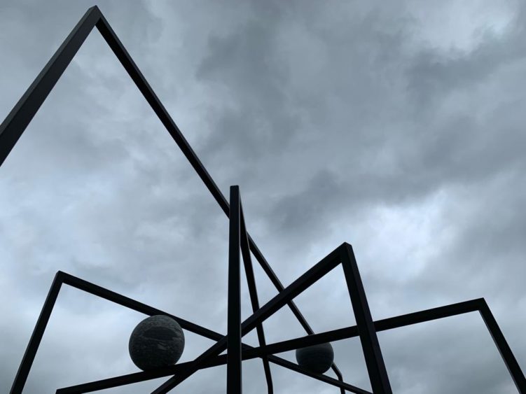 Pour la commande du Roof Garden, Kwade a créé deux sculptures : ParaPivot I et II. Ces sculptures imposantes se composent de cadres en aluminium poudré qui se croisent à différents angles. Nichées à l’intérieur, neuf énormes sphères semblent flotter en apesanteur. Les pierres taillées et polies, chacune aux couleurs et aux motifs variés, viennent de neuf pays différents, comme le marbre hermelin de Norvège ou le granit azul macaubas du Brésil. ParaPivot I et II inspirent la possibilité du mouvement : leur appendice métallique se déployant vers l’extérieur autour de multiples axes semble dessiner les orbites des globes. Elles évoquent ainsi un astrolabe, instrument scientifique inventé dans la Grèce Antique et adopté par les astronomes islamiques du Moyen Âge afin de tracer la trajectoire des étoiles et des planètes. Le ballet sculptural de Kwade fait également penser à un système solaire miniature, un morceau d’espace installé temporairement au Iris and B. Gerald Cantor Roof Garden.