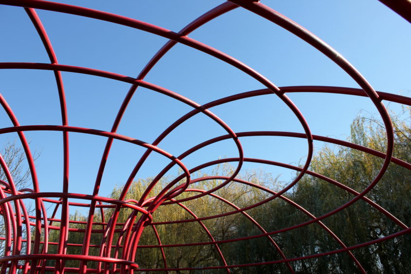 Toujours dans le domaine du loisir et du quotidien, auquel elle rajoute la dimension du temps et de l’histoire locale, Cristina Ataíde conçoit Rotter (2010-12), sorte de nasse utilisée pour la pêche artisanale en eau douce. Le simple acte d’agrandir l’objet le place dans une dimension conceptuelle, mais également physique en y permettant l’entrée du corps. Posée sur un petit talus, près du fleuve, la nasse n’est pas destinée à la pêche régionale mais à l’être humain, aisément retenu par la sculpture à cette échelle, par la couleur rouge rompant abruptement avec la neutralité verte du gazon et de l’enfilade de saules pleurant au-dessus du fleuve, et par l’emprisonnement apparent du corps, comme si ce dernier était aspiré à l’intérieur de cette grande forme toroïde.