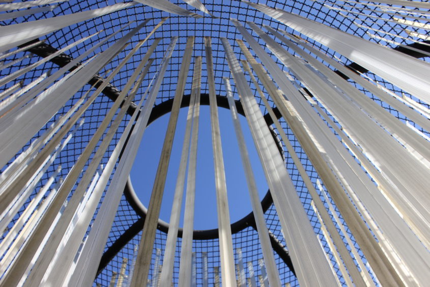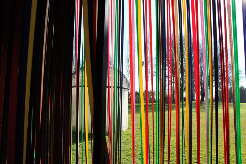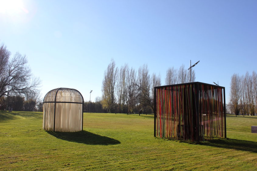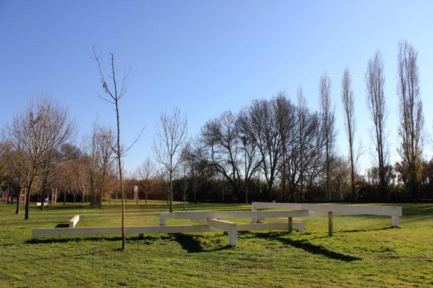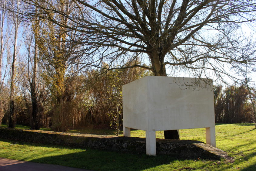 Curieusement, dans un pays dominé par une Lisbonne macrocéphale, il faut aller bien loin du centre, à Vila Nova da Barquinha, pour découvrir une des expériences les plus intéressantes et accomplies de sculpture contemporaine dans l’espace public portugais. Seul un fleuve relie ces deux localités – le Tage, fleuve pollué, opaque, égout qui charrie le mépris du capitalisme et du néolibéralisme pour l’environnement, mais n’en reste pas moins l’élément structurant d’une région et d’un paysage qui se sont construits en étroite connivence. C’est justement sur les berges de cette ligne d’eau sombre que le Parc de sculptures contemporaines Almourol (conçu par les architectes paysagers Hipólito Bettencourt et Joana Sena Rego) s’est installé, non seulement pour contenir les crues qui se déversaient sur la commune de temps à autre, mais également pour porter un projet artistique véritablement démocratique, attentif à la nature à la fois ludique et contemplative d’un parc d’agrément. Ici, pas de parcours prédéfini, mais bien une tentative de traduction dans le paysage d’un exercice péripatéticien et d’une expérience (phénoménologique, pourrait-on dire, non de réduction mais toujours d’expansion). Le parc est une invitation à la déambulation, à l’errance, à la rêverie. Toutefois, l’œuvre d’Alberto Carneiro, Sobre a floresta (Sur la forêt) (2012), s’impose en début de parcours, en raison de la place centrale occupée par Carneiro dans le paysage artistique contemporain portugais et de sa démarche unissant cette double nature ludique et contemplative, ou encore spirituelle, de l’art dans des parcs publics. Près d’un miroir d’eau, sur le vert saturé de la pelouse, Carneiro érige une série de colonnes de granit, en cercles concentriques. Imaginez une forêt de troncs durs en granit, disposés le long de plusieurs anneaux de diamètres différents. Une fois à l’intérieur, le visiteur perçoit immédiatement son organisation mystique, cardinale, accueillant la nature élémentaire de l’univers. Entrer dans cette sculpture, scruter le paysage à travers ces troncs devenus minéraux, c’est établir un lien immédiat, nirvanesque, avec le cosmos. A l’ « Ouest », « terre » égale « vie » égale « art ». Au « Nord », « eau » égale aussi « art » égale aussi « vie ».