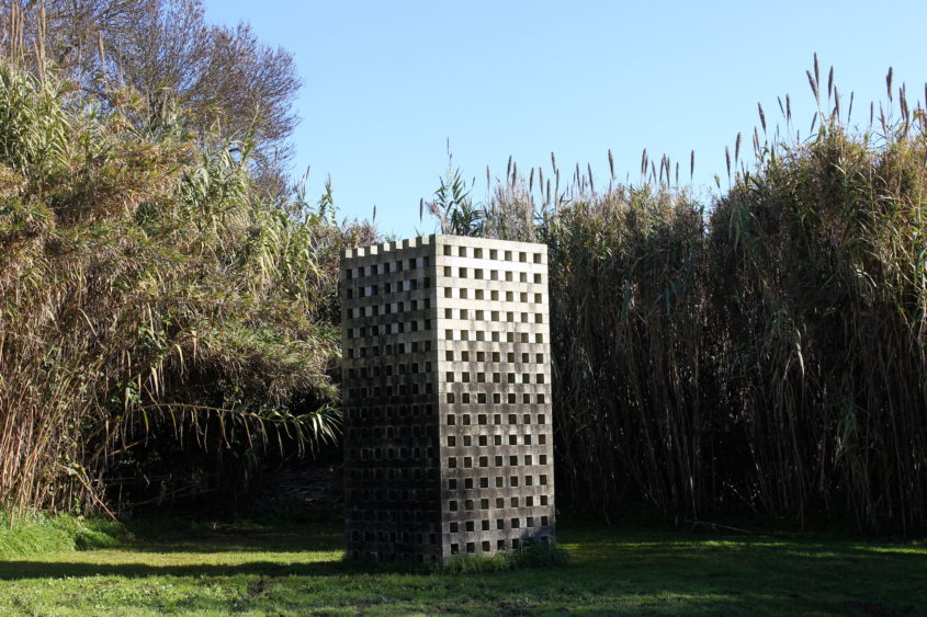 A l’une des extrémités du parc, bordée de hauts roseaux, Pedro Cabrita Reis dresse un puissant bloc de granit dans le paysage horizontal environnant, dans un jeu d’appropriation et de citation de formes historiques et architecturales. Non loin de là, le Château d’Almourol et son donjon défient les éléments alentour, comme le fait la sculpture Castelo (Château) (2012), de Cabrita Reis. De la même façon, l’artiste restitue au présent les anciens repères et symboles de pouvoir architecturaux et urbains. Après tout, la verticalité est encore la forme par excellence du pouvoir.