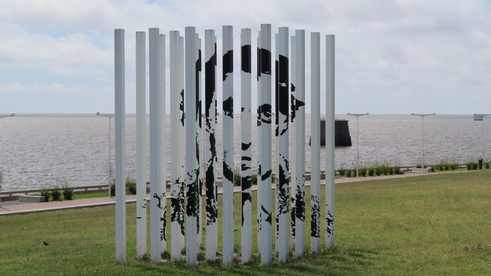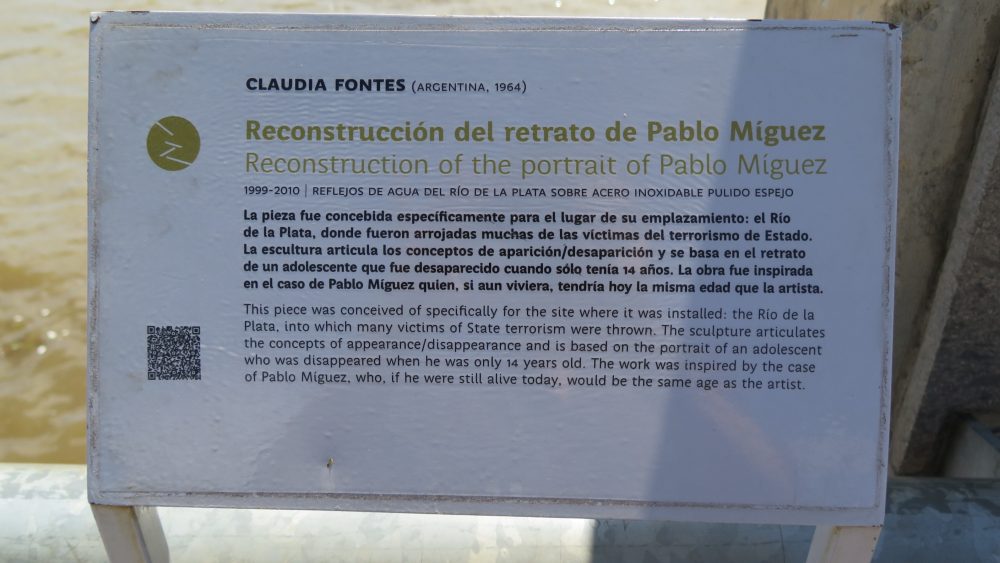 Ou encore celle de Claudia Fontes, artiste argentine née en 1964, Reconstrucción del retrato de Pablo Míguez. À 40 m du bord, installé dans le Rio de la Plata, en mémoire aux disparus jetés dans ce fleuve, se trouve un petit personnage en acier inox que l’eau, en s’y reflétant, fait disparaître. Pablo Míguez, disparu à l’âge de 14 ans, aurait aujourd’hui le même âge que l’artiste.