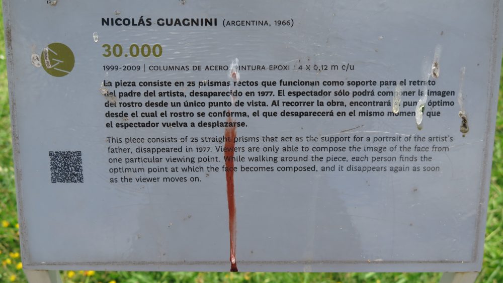 Sur chaque cartel qui accompagne les œuvres, toutes poignantes : l’intention de l’artiste. Comme celle de Nicolás Guagnini, artiste argentin né en 1966, intitulée 30.000. Sur vingt-cinq poteaux en prisme de quatre mètres de haut, espacés les uns des autres de façon régulière, est imprimé le portrait du père de l’artiste, disparu en 1977. En se déplaçant autour de l’œuvre, on arrive à l’angle précis où ce portrait est entièrement reconstitué. Il se décompose et s’efface lorsqu’on se déplace à nouveau.