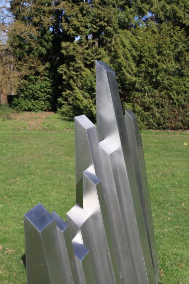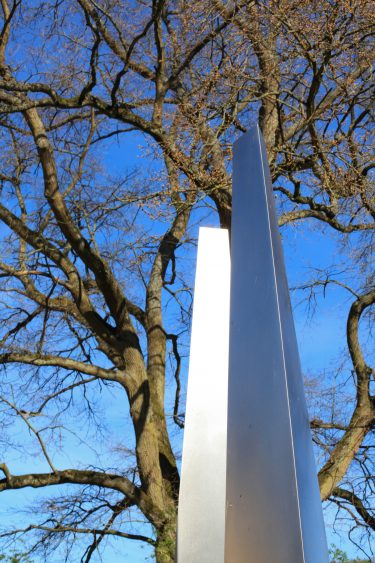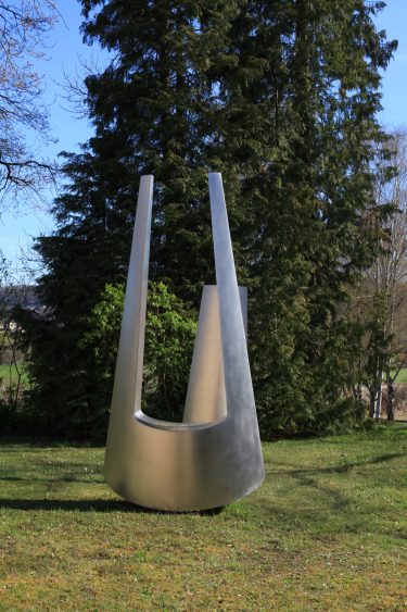Un peu plus loin, une autre sculpture de Marta Pan, Passage (2004), fabriquée dans un matériau cher à l’artiste, l’acier inoxydable, qui, grâce à sa finition satinée crée des jeux de couleurs incroyables en résonance avec la lumière du ciel.