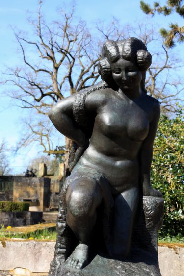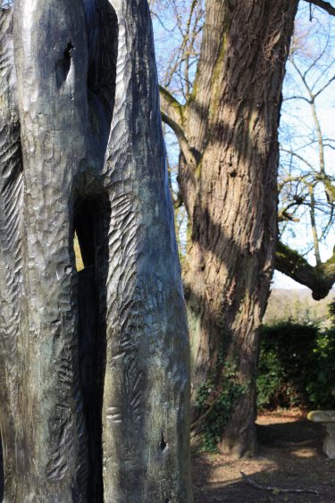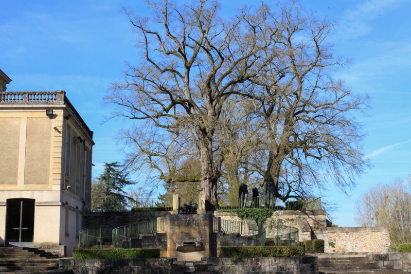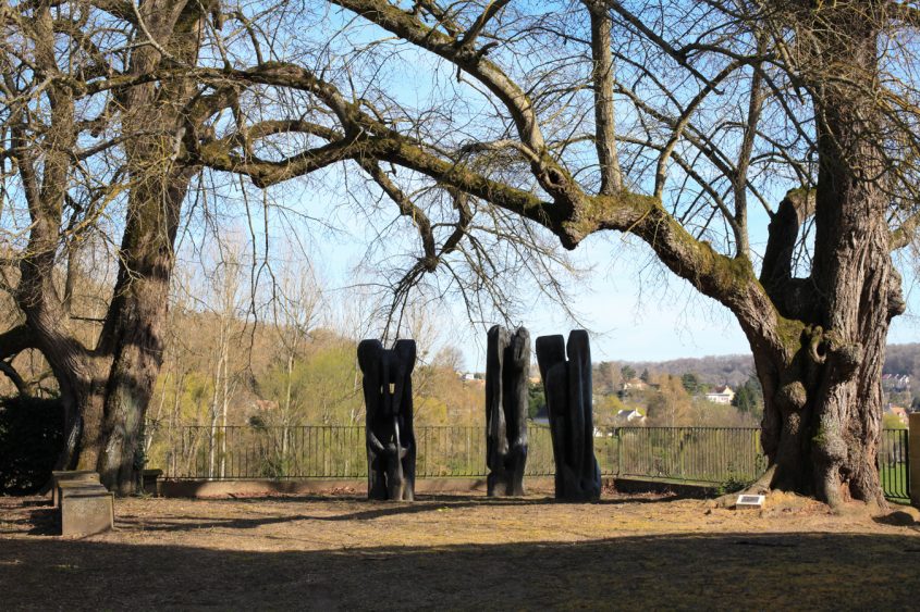Un escalier en pierre relie le Jardin des bronzes au parc du château. Sur la droite, trois personnages d’Etienne-Martin s’abritent discrètement à l’ombre des arbres. À mi-chemin entre forme humaine et végétale, les trois sculptures en bronze composant Personnage III (1967) ont été fondues à partir d’originaux en bois d’acacia. Le remarquable travail de la matière se dissimule parfaitement avec l’écorce des troncs alentour.