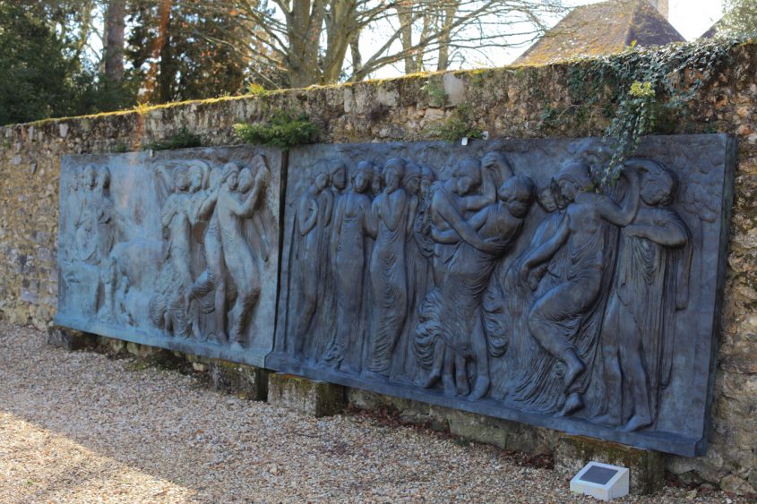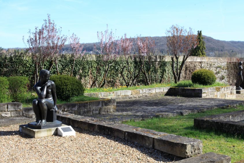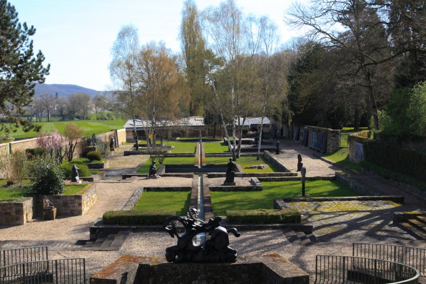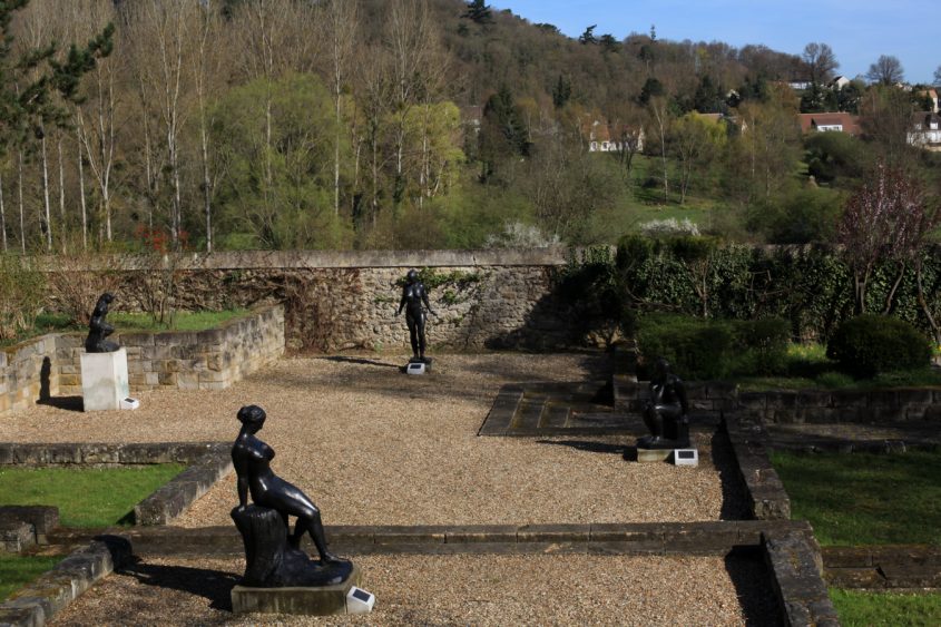 Ancien verger réhabilité par l’architecte Robert Auzelle, le jardin est organisé autour d’un canal central qui le parcourt en longueur, en reliant plusieurs bassins d’eau. D’un côté comme de l’autre se déploient les terrasses, habitées pour la plupart par des sculptures figuratives en bronze du milieu du XIXème siècle jusqu’à nos jours. Il s’agit de la collection du domaine, donc principalement des œuvres de Joseph Bernard, d’Antoine Bourdelle, de Robert Wlérick, de Rodin, entre autres. Faunes, bacchantes, jeunes filles en train de danser ou de contempler la nature, animent la vie du jardin et vous tendent la main pour passer de sculpture en sculpture.
