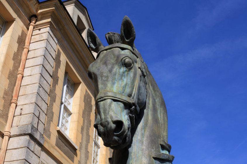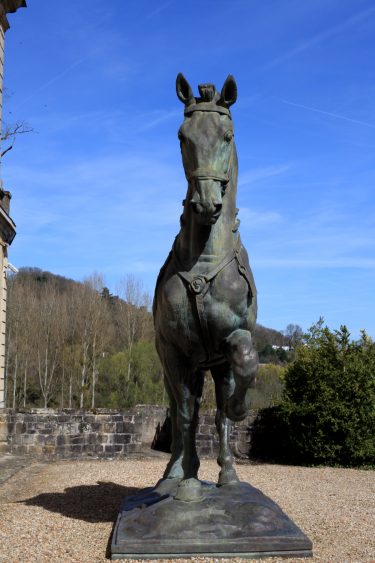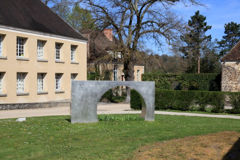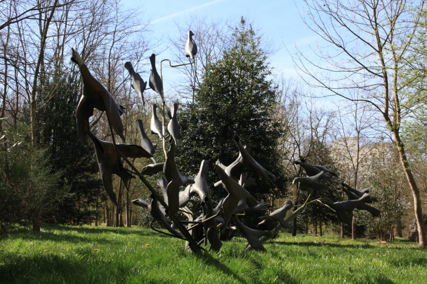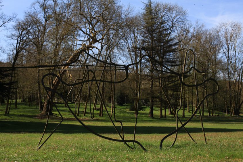 On arrive enfin au niveau de l’allée à la française, devant le château, pour retrouver, entre autre, le Cheval monumental de Bourdelle, monument très imposant de 14 mètres de haut, Sculpture en U et Positif du U (1998), toujours signées Marta Pan. Cette dernière œuvre, constituée de deux éléments complémentaires, coupe et recadre constamment le paysage, en absorbant toute la lumière autour – comme si la sculpture se chargeait de l’énergie de la nature. Selon la couleur du ciel et l’intensité de la lumière, l’acier varie du blanc, au bleu, au gris sombre presque noir.