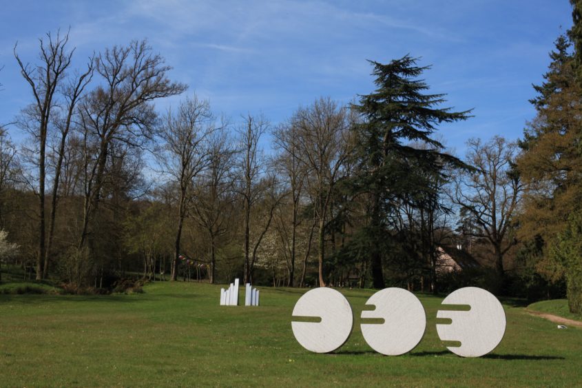 Dès que l’on arrive à l’étendue du parc, Les Trois disques fendus de Marta Pan attirent immédiatement l’œil du visiteur. Il s’agit de trois disques de granite blanc placés l’un à côté de l’autre, face au château, à une quarantaine de mètres de distance de celui-ci. On reconnait les lignes pures et précises de l’artiste hongroise, rendues encore plus définies par le blanc éclatant du granit de Bethel. Les disques sont fendus à différents endroits et présentent différentes épaisseurs, de 20 cm en bas à 6,5 cm en haut.