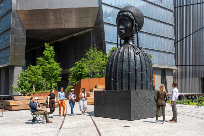 Le monumental buste féminin de Simone Leigh, intitulé Brick House, inaugure la High Line’s Plinth, un espace situé à l’intersection de la 30ème rue et de la 10ème avenue à New York. Le Plinth, ouvert assez récemment, est dédié à l’exposition de sculptures publiques, et Brick House est la première à y être exposée. Haut de près de 5 mètres, ce buste de femme noire à l’expression sereine porte son regard sur la 10ème avenue, imposant une présence raciale sous la forme d’une sculpture figurative. Selon les notes de presse, les influences de Brick House sont multiples et complexes – généralement associant des références architecturales africaines et afro-américaines au corps humain. Pour ce qui est de Brick House, les influences, et en particulier celles concernant les formes arrondies de la partie inférieure du visage, s’inscrivent aussi bien dans l’architecture Battammaliba du Bénin et du Togo ; dans les teleuks du peuple Mousgoum du Cameroun et du Tchad ; et dans l’architecture du restaurant Mammy’s Cupboard dans le Sud des Etats-Unis. La tête dénuée d’yeux, au visage plat, interpelle par sa coiffure complexe. Une coupe afro courte couvre une grande partie de la tête, autour de laquelle s’enroule une tresse prolongée de quatre autres tresses serties de cauris, tombant sur les épaules de la femme.
