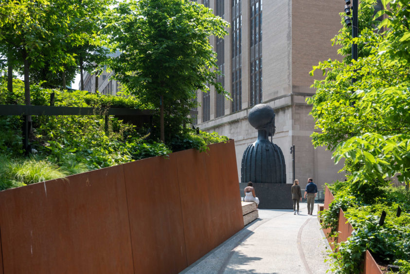 Peut-être pourrait-on également penser que Leigh exécute ici un rite d’indépendance culturelle face à des siècles de négligence préjudiciable. Le buste, installé sur un piédestal de plus d’un mètre de haut, se détache merveilleusement des hauts buildings qui l’entourent. Et pourtant, déterminée, la femme garde son identité, sauvegardant ainsi les bases culturelles dont elle est le fruit, mais aussi permettant à la communauté artistique noire de New York d’aller de l’avant – vers un monde où la promesse d’une culture noire est pleinement comprise et incite à la création d’autres œuvres de ce type. Leigh est relativement nouvelle au sein d’un groupe d’artistes afro-américains dont le travail s’inscrit résolument dans la culture noire – allez voir les peintures narratives de Kerry James Marshall, ou les silhouettes racialisées de Kara Walker.